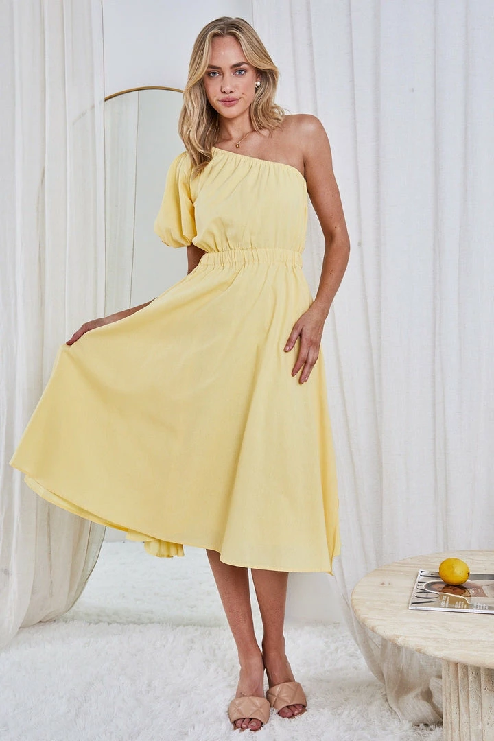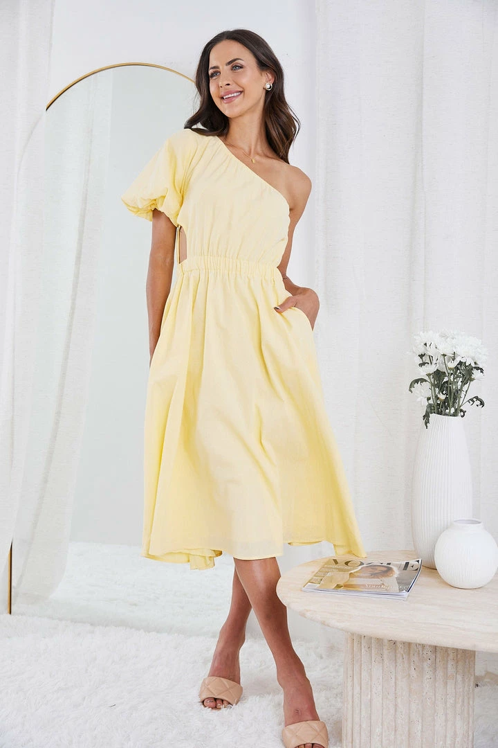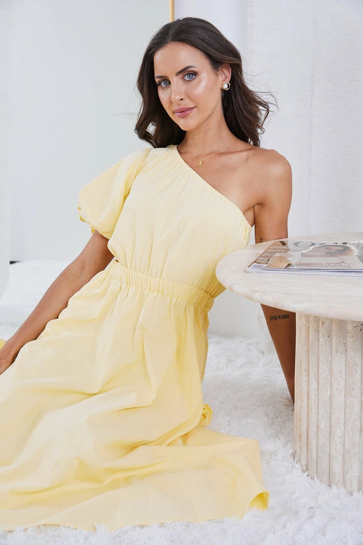 Our Perlita Dress is made from fine cotton fibers and finished in a bright shade of yellow, this dress will be a unique and luxurious addition to your summer wardrobe. This midi features a one shoulder, short sleeve cinched above the elbow, cinches in at the waist and falls to an easy length that looks chic with sandals.