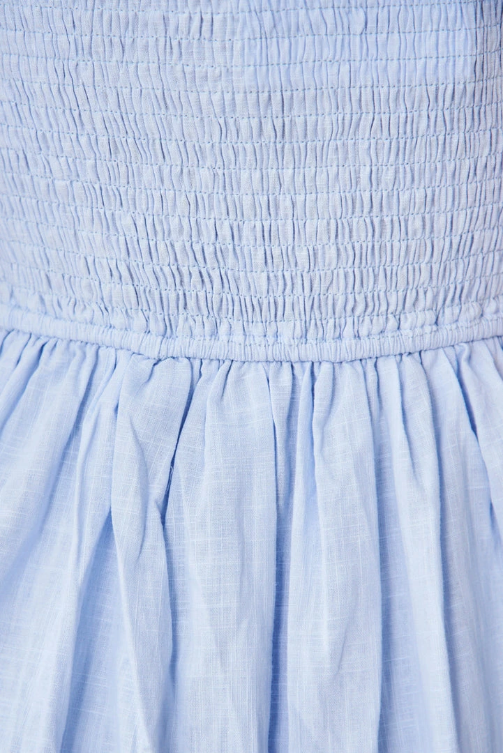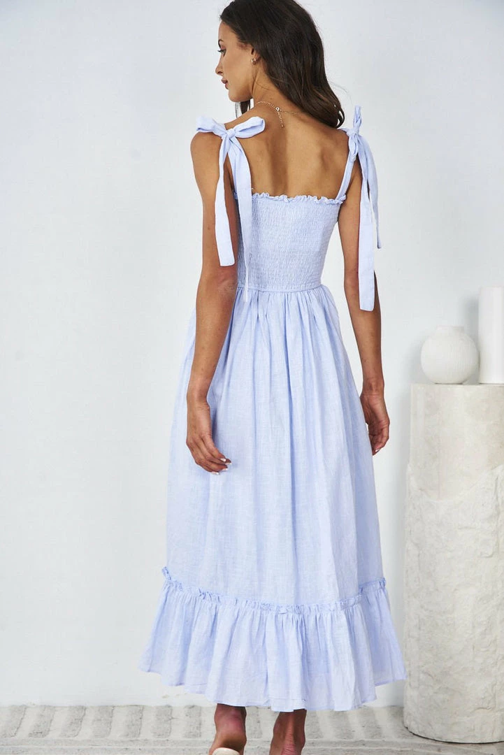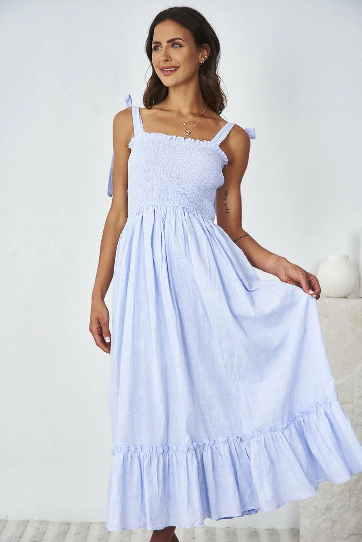 Our Fortune Dress comes in a light blue tone. It’s a sleeveless maxi that features a square neckline and a tiered skirt. This flowy maxi pairs beautifully with heels for a stunning look this spring season!