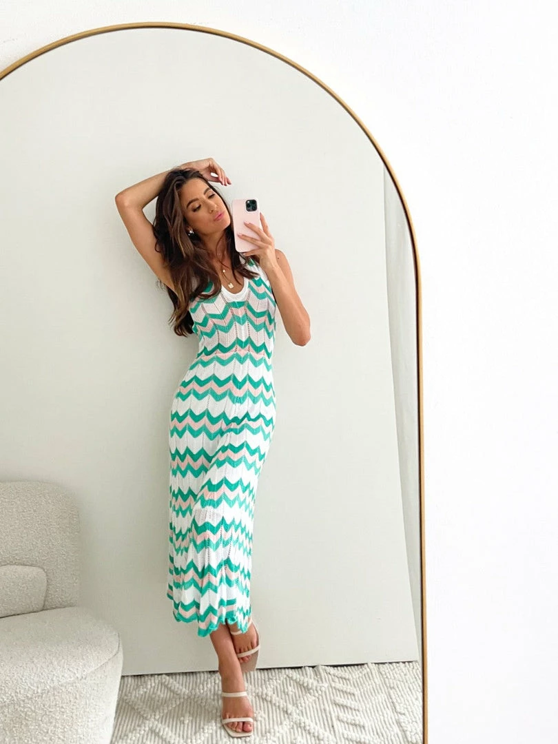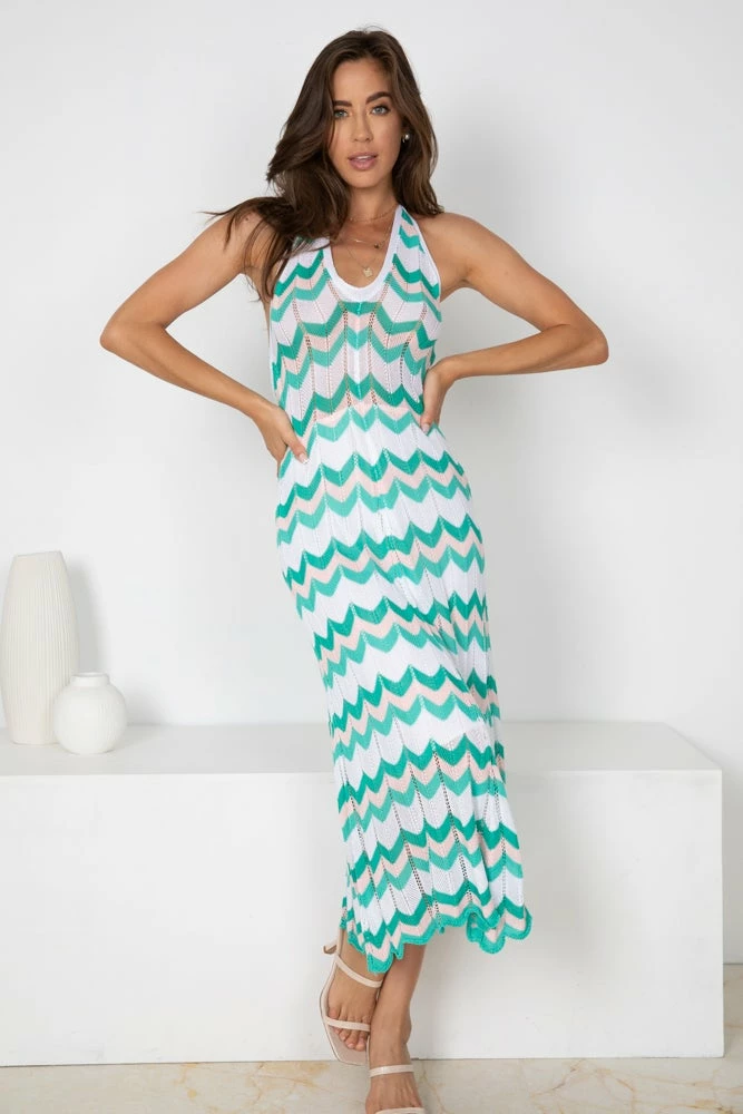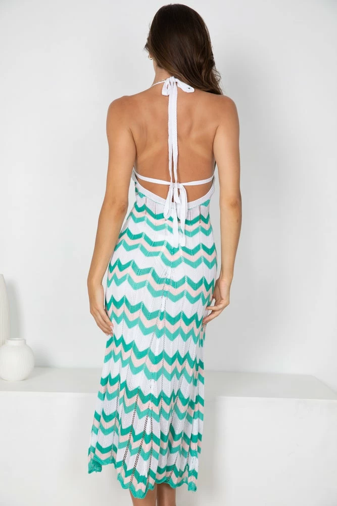 - Key Features: Slim fit. Midi length. V neckline. Halter. Open back. Tie detailing.