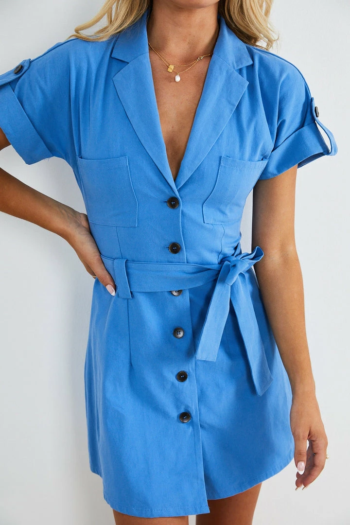Our Nery Dress comes in a blue tone. This button-through dress is an updated durable style making it an easy building block for your spring-summer wardrobe! Featuring classic collars, folded short sleeves, pockets, and a matching fabric tie to cinch the waist!