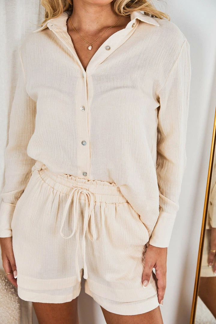 Our Pisces Top is the perfect off-duty look. This neutral beige shirt features a collared V neckline, buttons on the front, and buttons on the cuffs. This shirt can be easily dressed up for the office or down by pairing it without Pisces Shorts for a casual-cool look!
