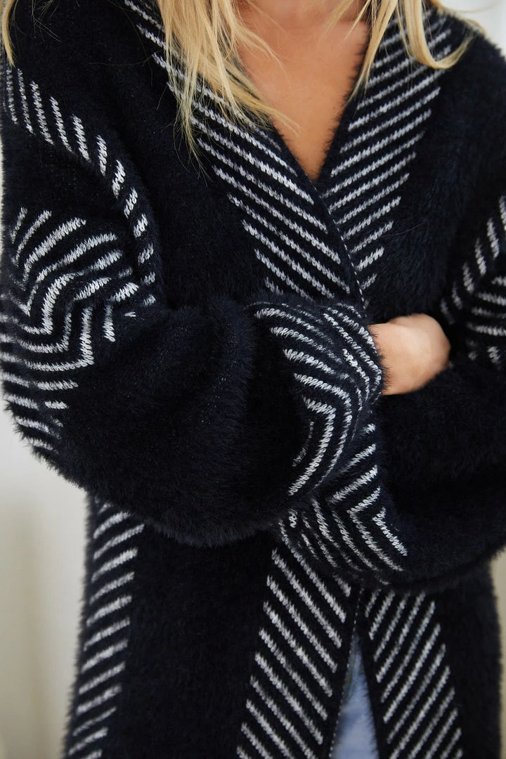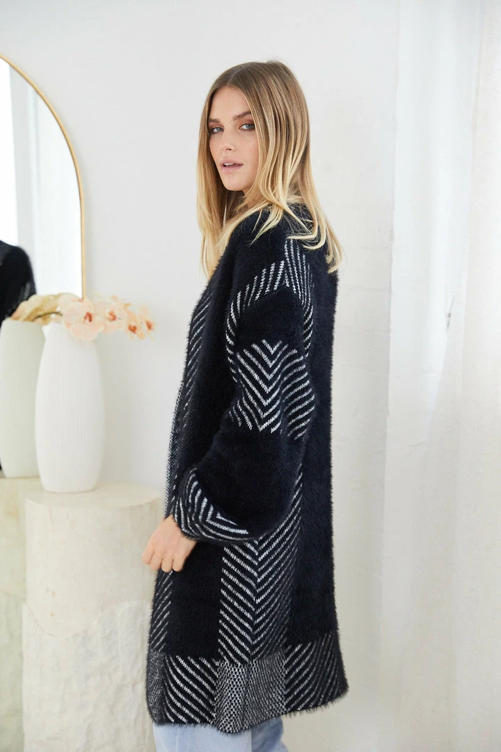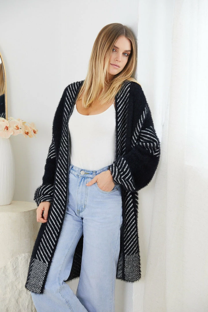 Our Tima Cardigan comes in a deep black base with white tone line prints. Feel like you’re wrapped up in bed with your heater on in this long sleeved knit cardigan that features an open front and a knee-length hem. It perfectly wears as a layer for our Charmaine Singlet – White and Gigi Jeans – Light Blue!