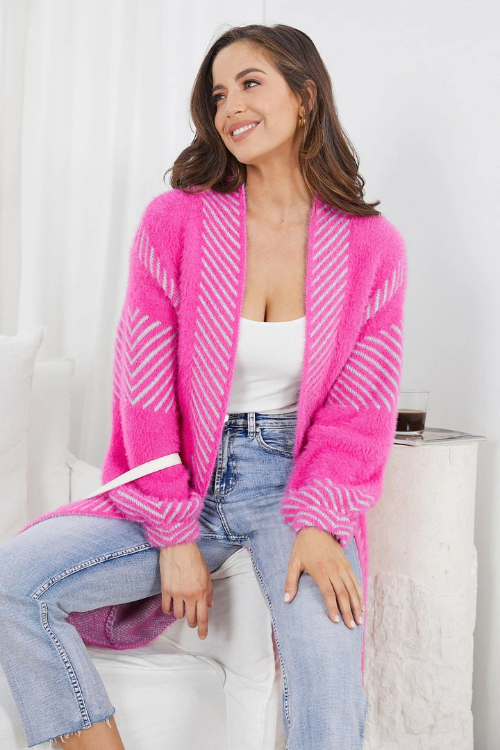 Our Tima Cardigan comes in a pink print base with lavender tone line prints. Feel like you’re wrapped up in bed with your heater on in this long sleeved knit cardigan that features an open front and a knee-length hem. It perfectly wears as a layer for the cold months ahead!