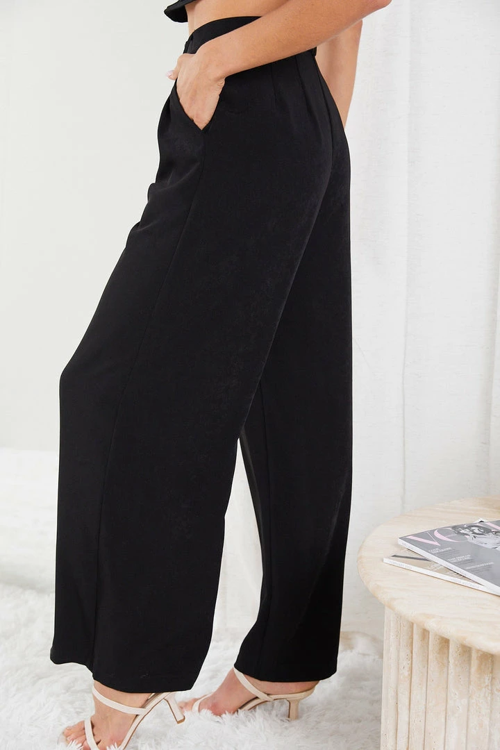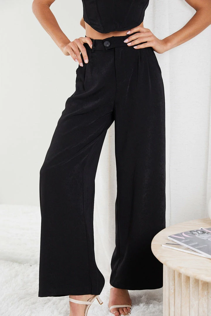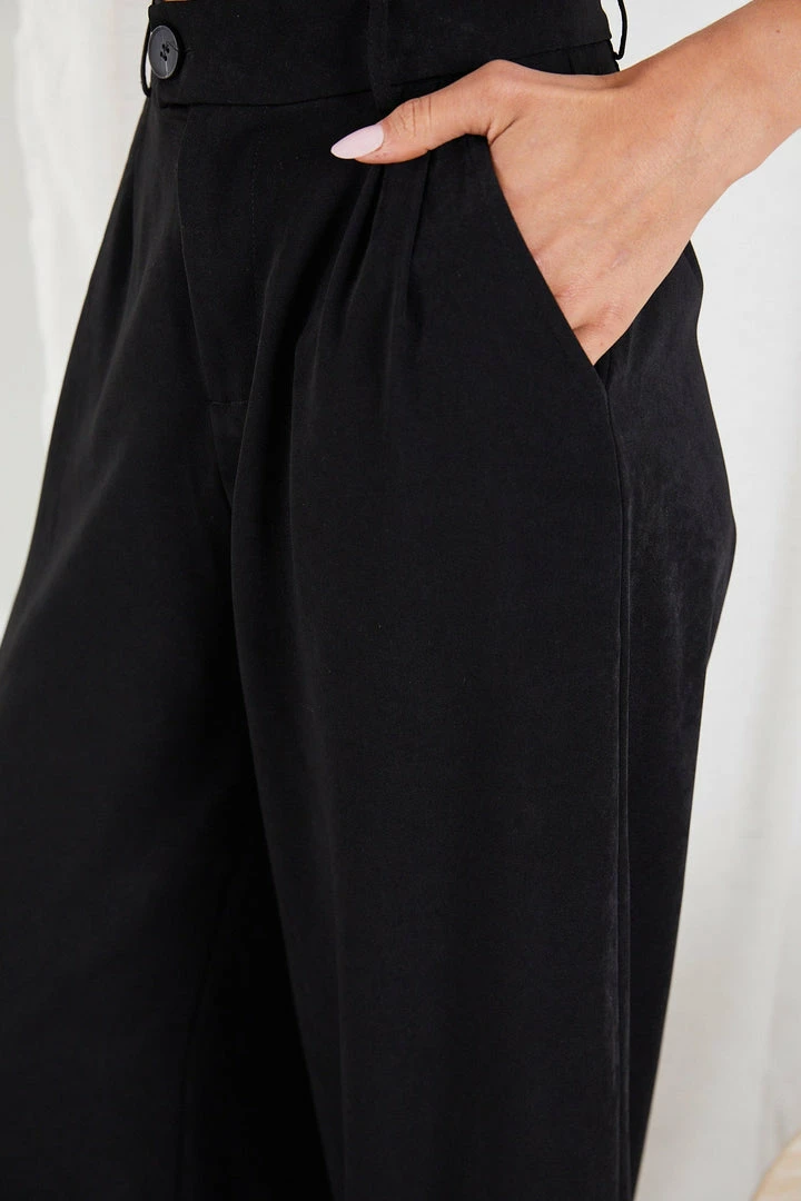 Our Adamaris Pants come in a deep black tone. Dare for some flare in these comfortable wide-legged pants featuring a button and zip closure on the front, belt loops on the waistband, pleats, and side pockets for practicality. These go well with plain or printed tops and flats or heels.