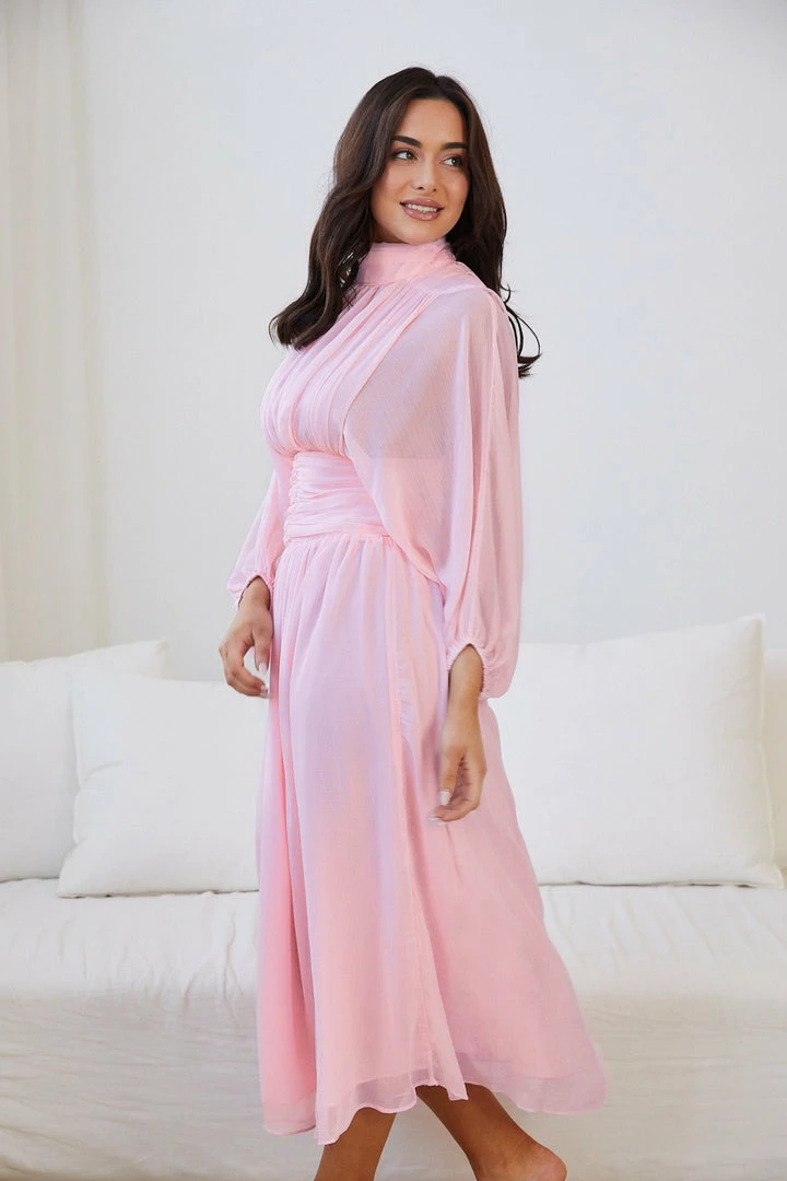 Our Analey Dress comes in a light pink colour. Be red carpet ready in this long exquisite dress that features a high neckline, long sleeves elasticated at the cuff, maxi length hemline, invisible zipper at the back and ruched detailing on the bodice and waist hugging your shape at the right places. Put on a smokey make up and pair with a minaudiere bag for your next soiree.