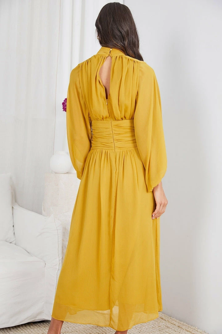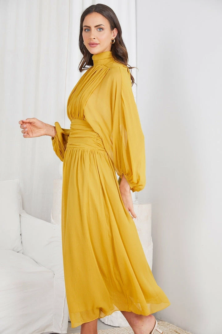 Our Analey Dress comes in a classy mustard colour. Be red carpet ready in this long exquisite dress that features a high neckline, long sleeves elasticated at the cuff, maxi length hemline, invisible zipper at the back and ruched detailing on the bodice and waist hugging your shape at the right places. Put on a smokey make up and pair with a minaudiere bag for your next soiree.