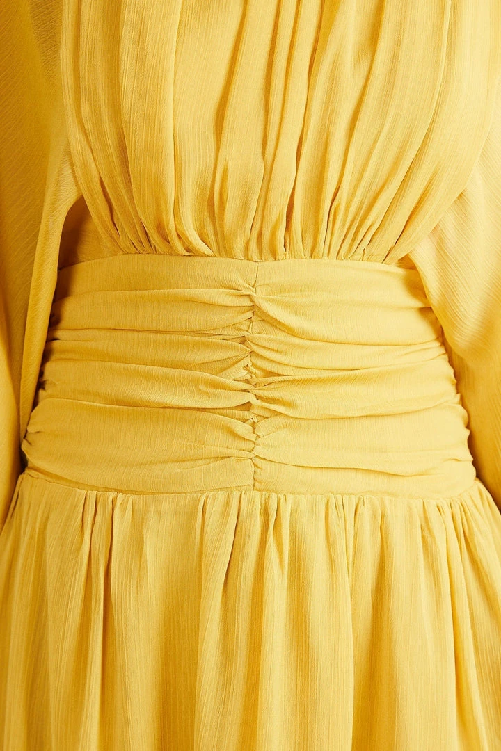 - Key Features: Ruched detailing. Long sleeves. Maxi length. Invisible back zipper.