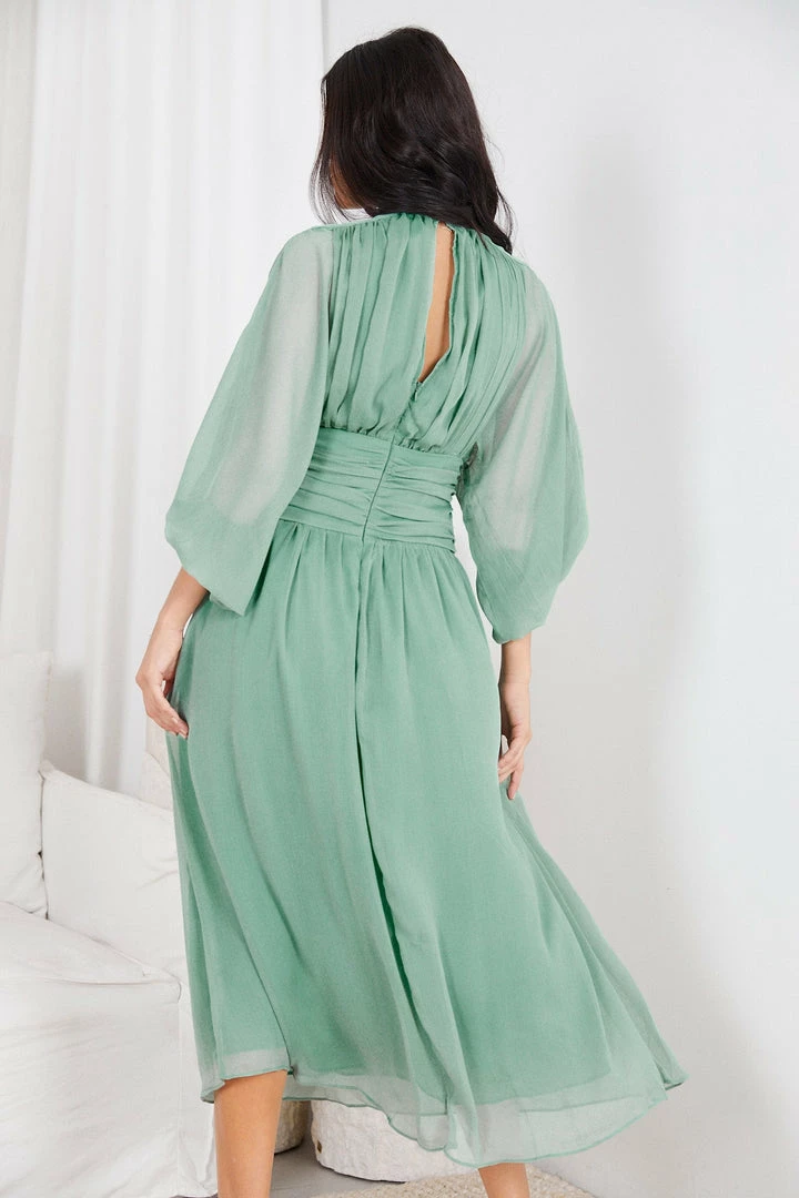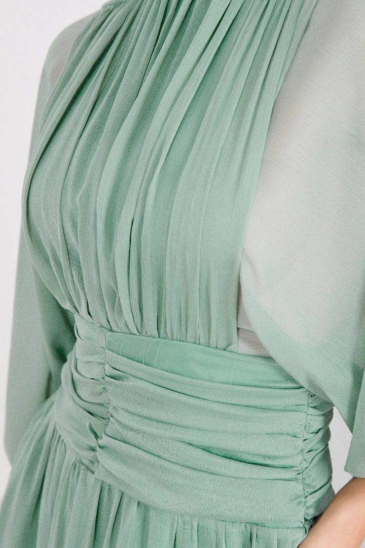 Our Analey Dress comes in a classy sage colour. Be red carpet ready in this long exquisite dress that features a high neckline, long sleeves elasticated at the cuff, maxi length hemline, invisible zipper at the back and ruched detailing on the bodice and waist hugging your shape at the right places. Put on a smokey make up and pair with a minaudiere bag for your next soiree.