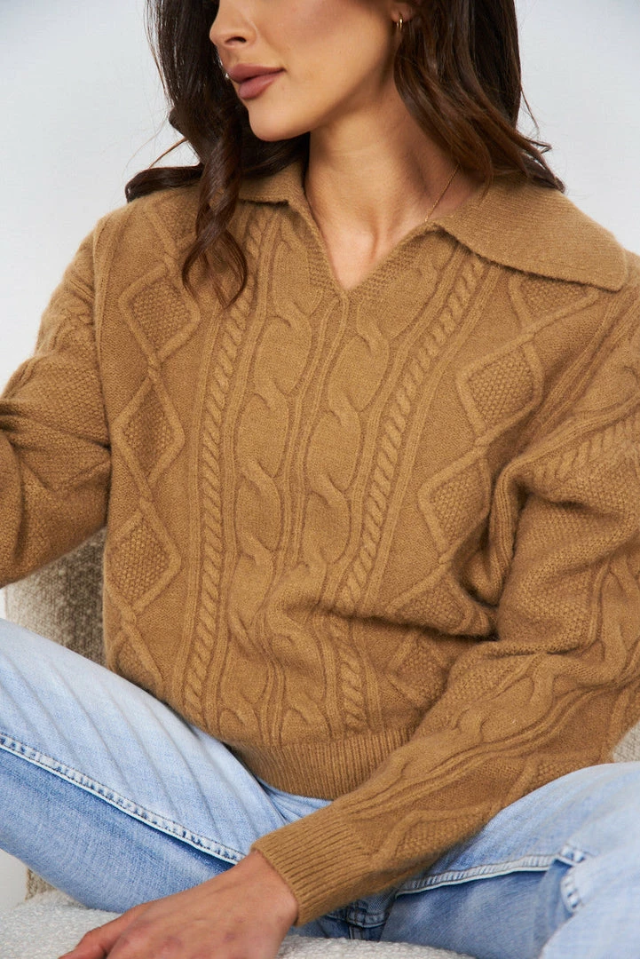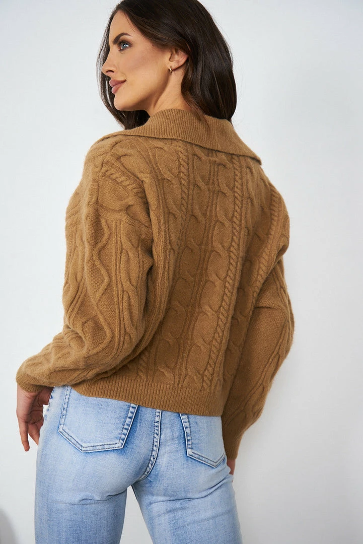 Our Aubrey Knit comes in a warm tan tone. It features a v neckline, long relaxed sleeves and a single layered, knit Johnny collar. This knit is the perfect for layering during the colder months ahead!