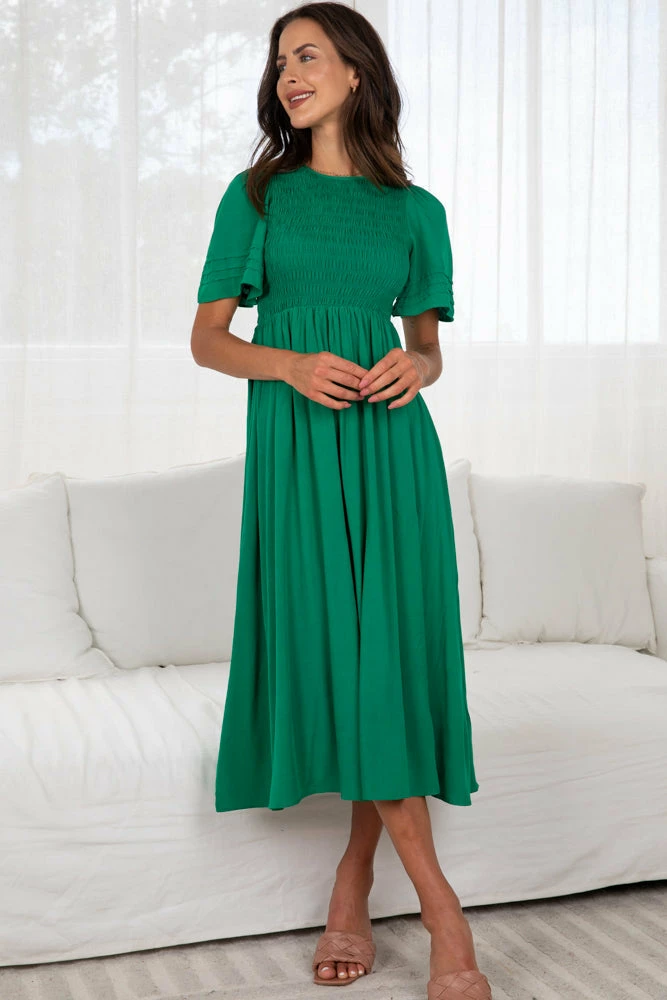 Our Iolana Dress comes in a lovely earthy green tone. The midi features a round neckline, short sleeves and textured shirring across the chest. This stunning midi pairs wonderfully with sandals or heels for a stunning formal look!