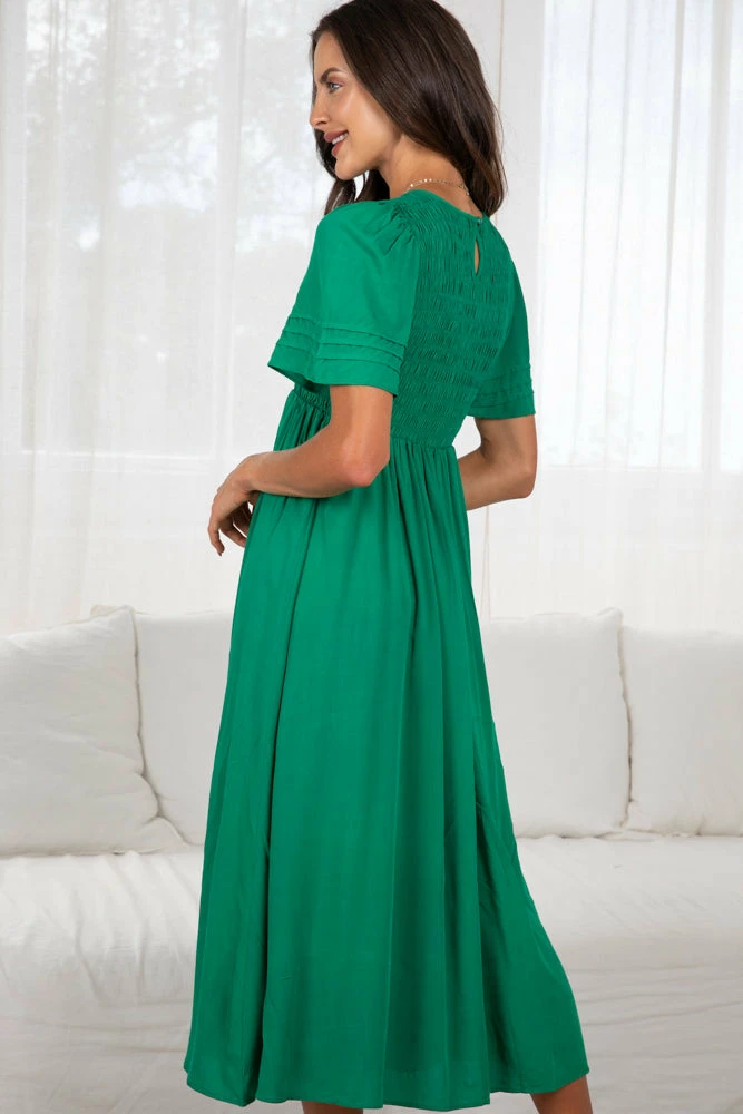 - Key Features: Midi length. Relaxed fit. Round neckline. Shirred bust. Short sleeves. Bump friendly. Maternity friendly.