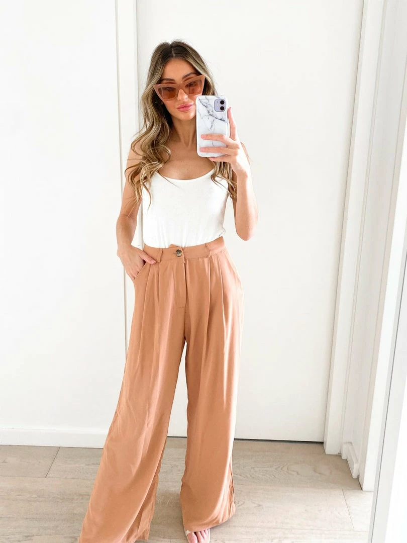 Our Clemency Pants come in a classic neutral beige tone. They feature a midi length, pockets on the front sides, and belt loops around the waist. These versatile pants pair wonderfully with so many styles!