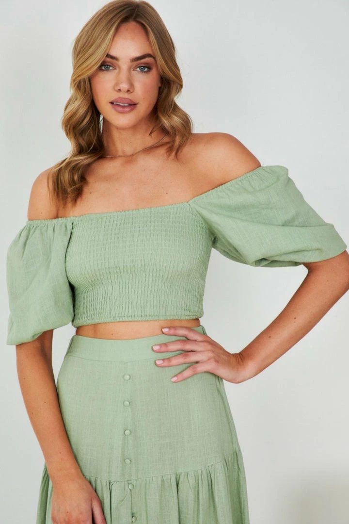 - Key Features: Crop. Elasticated bodice. Square neckline. Adjustable shoulder. Short puff sleeves. Slim fit.
