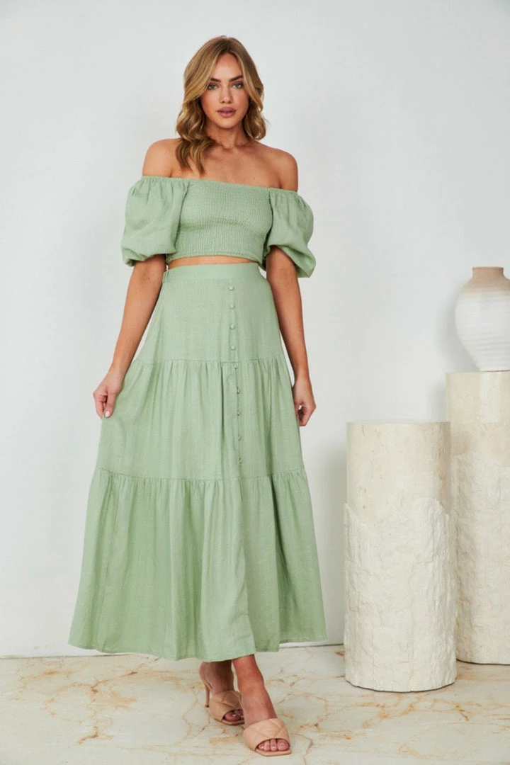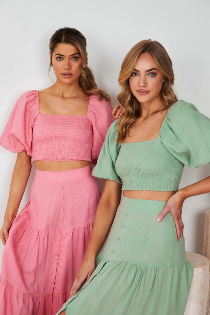 Our Jayla Top comes in a soothing sage tone. It features a cropped length, square neckline & short sleeves. This cropped top pairs beautifully with basic pants or our Jayma skirt for an effortless casual look this spring season!