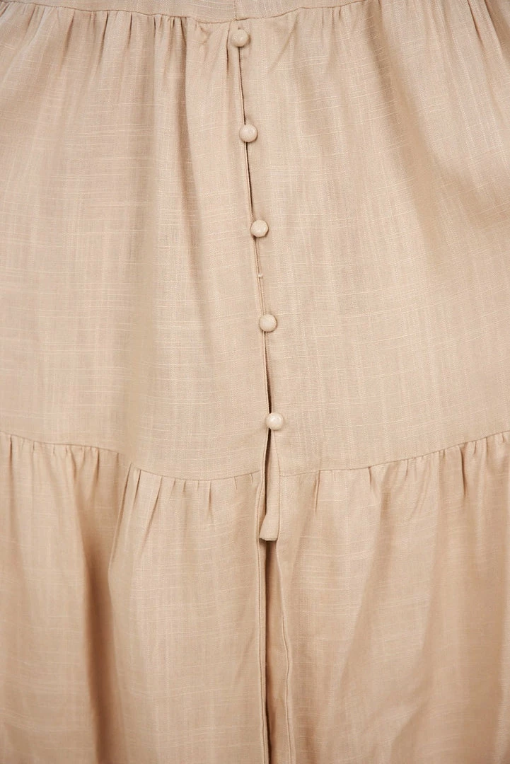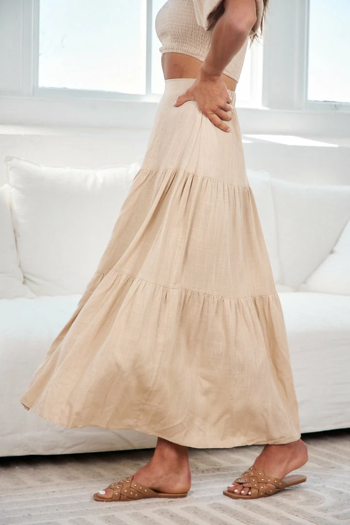 Our Jayma Skirt comes in a classic neutral beige tone. It features buttons down the front, tierred and gathered fabric in a midi length. Pairs beautifully with a basic top for an effortless casual look this spring season!