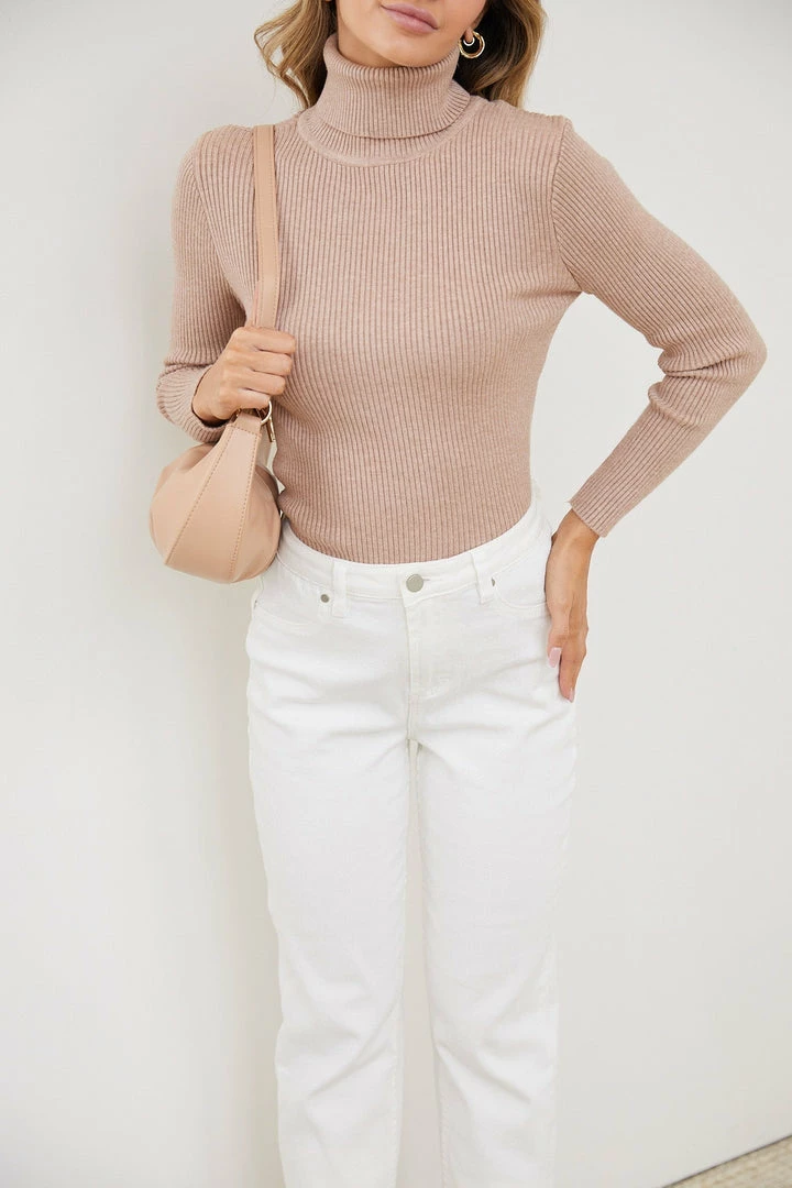 Our Zeruah Knit Top comes in a pretty beige colour. Dive into the beauty of subtlety with this stretchy piece that features a turtleneck collar and long fitted sleeves. The rib knit pattern all over is a stunning pair to embroidered pants and statement pumps!