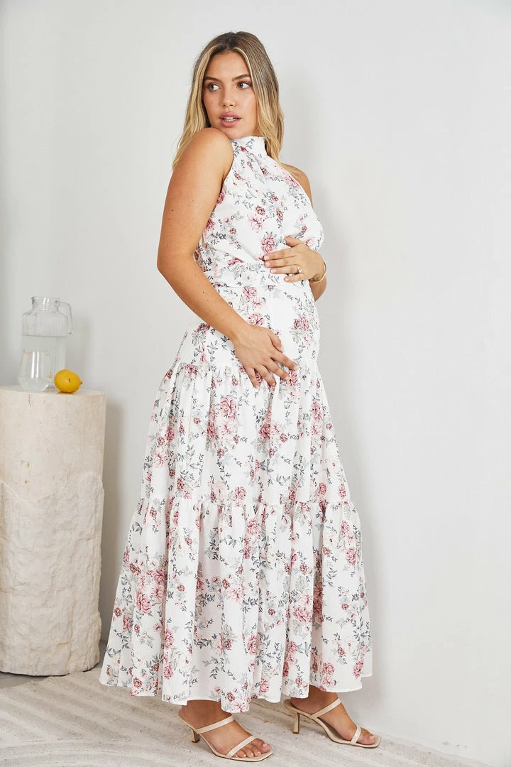 - Key Features: Maxi length. Lightweight. Relaxed fit. Fabric waist tie with loopholes to hold. Frill detailing. Halterneck style. Tiered skirt. Maternity friendly.