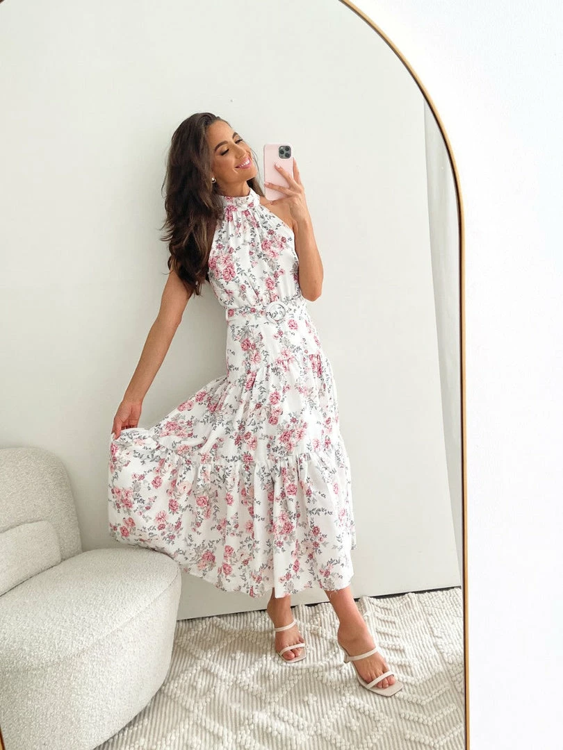 Our Kobi Dress is a gorgeous halter neck style maxi that comes in a pink-tone floral print. The frill hemline & fabric waist tie cinches the figure beautifully & is a lovely feminine addition to the wardrobe.