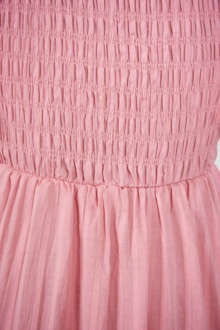 Our Iolana Dress comes in a soft pink tone. It features a round neckline, short sleeves and a textured pattern across the chest. This stunning midi pairs wonderfully with boots or heels for a stunning formal look!