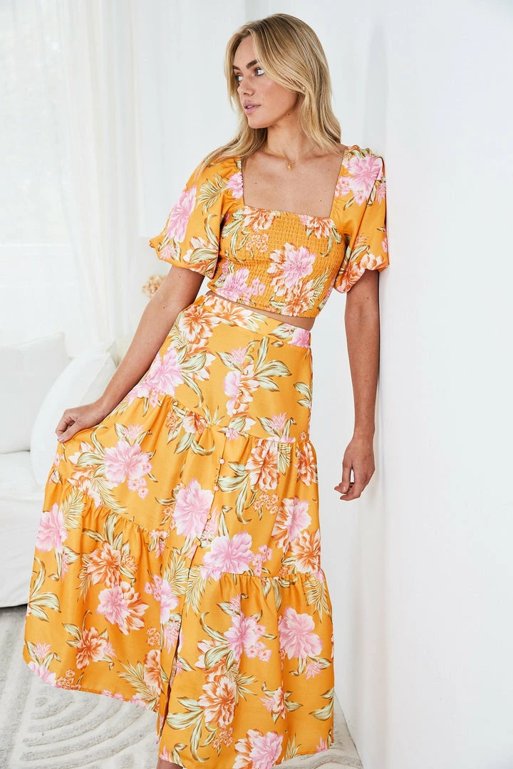 Our Jayma Skirt comes in a classic neutral beige tone. It features a midi length, and pairs beautifully with a basic top or our Jayla Top for an effortless casual look this spring season!