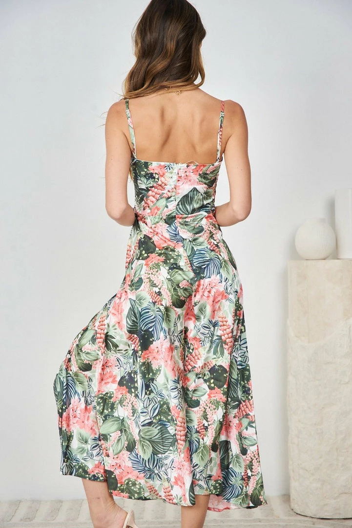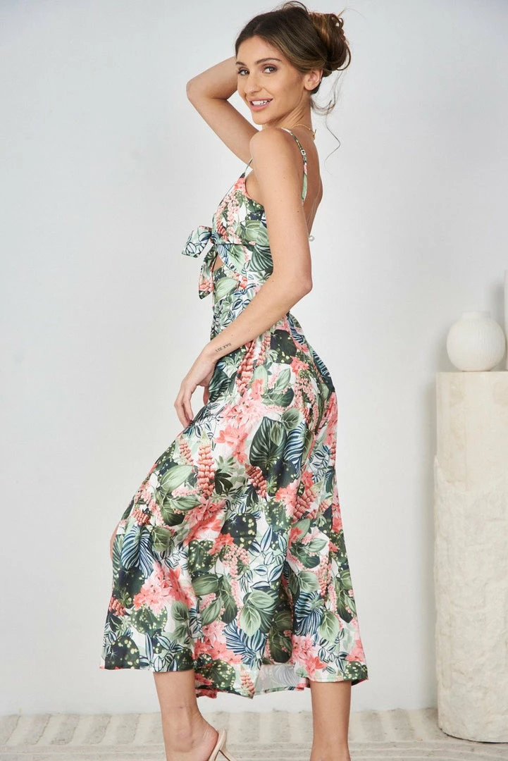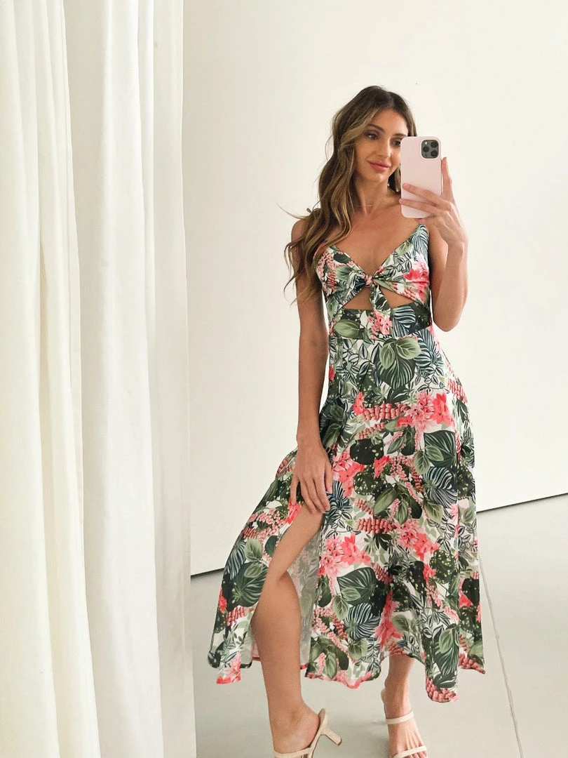 Our Karago Dress is a white tone base with green & pink tone floral print. This textured printed midi comes in a lightweight non-stretch fabrication that you’re sure to love during the warmer months. The gorgeous tie up bust and easy adjustable spaghetti straps are feminine & comfortable additions to this garment. The skirt flows out making this ideal for maternity wear.