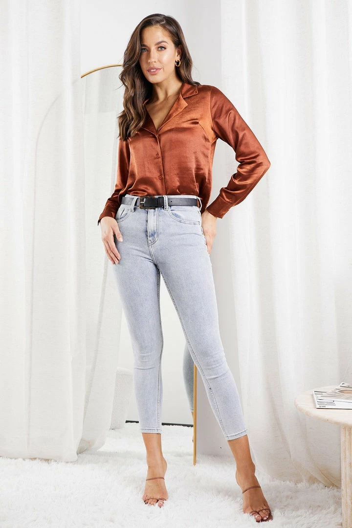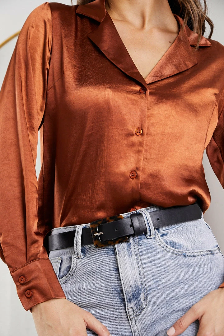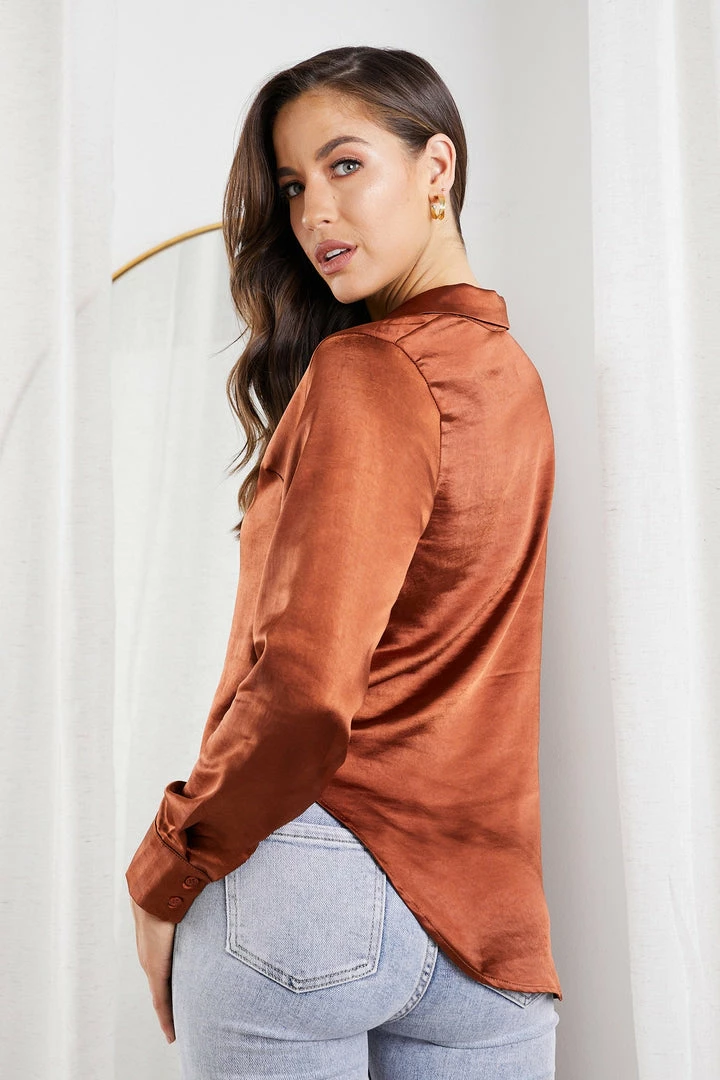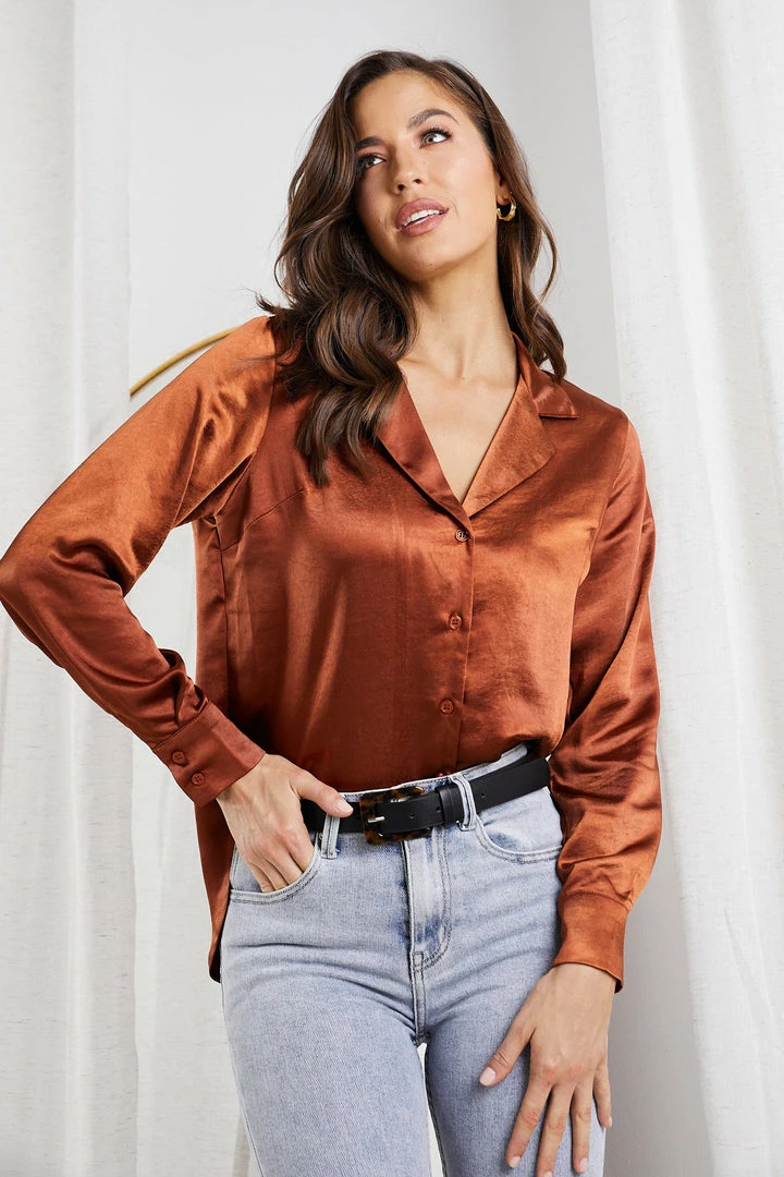 Our Pumpkene Shirt comes in an orange rust colour. Ready, set and glow in this shiny satin top that features a notch collar, buttons down the curved hem, bust darts and cuffed long sleeves. It’s an elevated classic piece that pairs well with a draped skirt and mule heels.