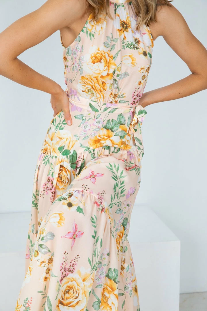 Our Tobi Dress is a gorgeous halter neck style maxi that comes in a peach base with yellow, rust, sage, and blush floral prints. The frill hemline & fabric waist tie cinches the figure beautifully & is a lovely feminine addition to the wardrobe.