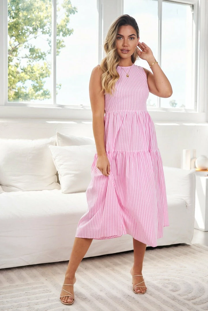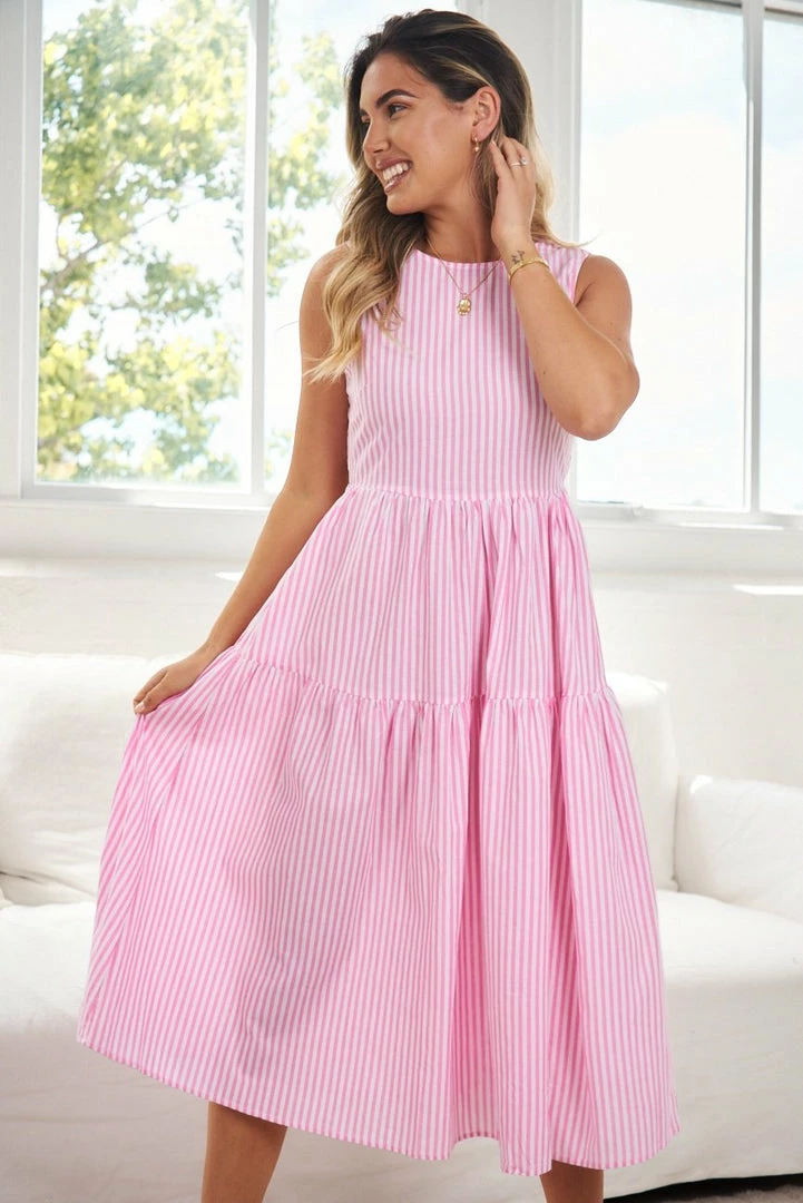 Our Winslove Dress comes in a pink & white tone stripe print. This wardrobe staple features a round neckline, tiered skirt with gathered detailing and subtle high-low hem. This easy breezy midi is perfect for the warmer weather!