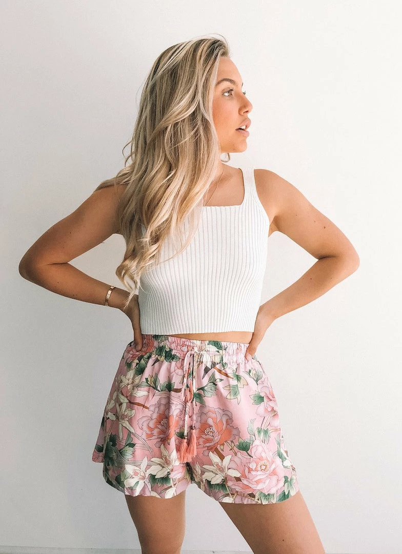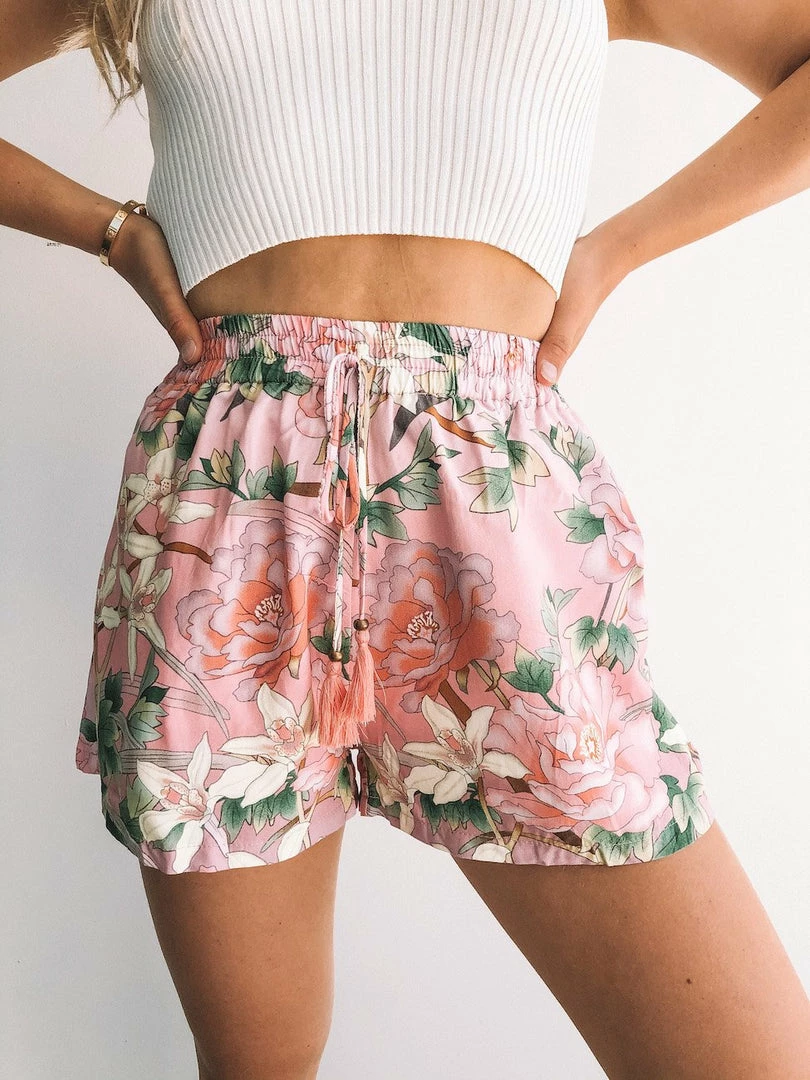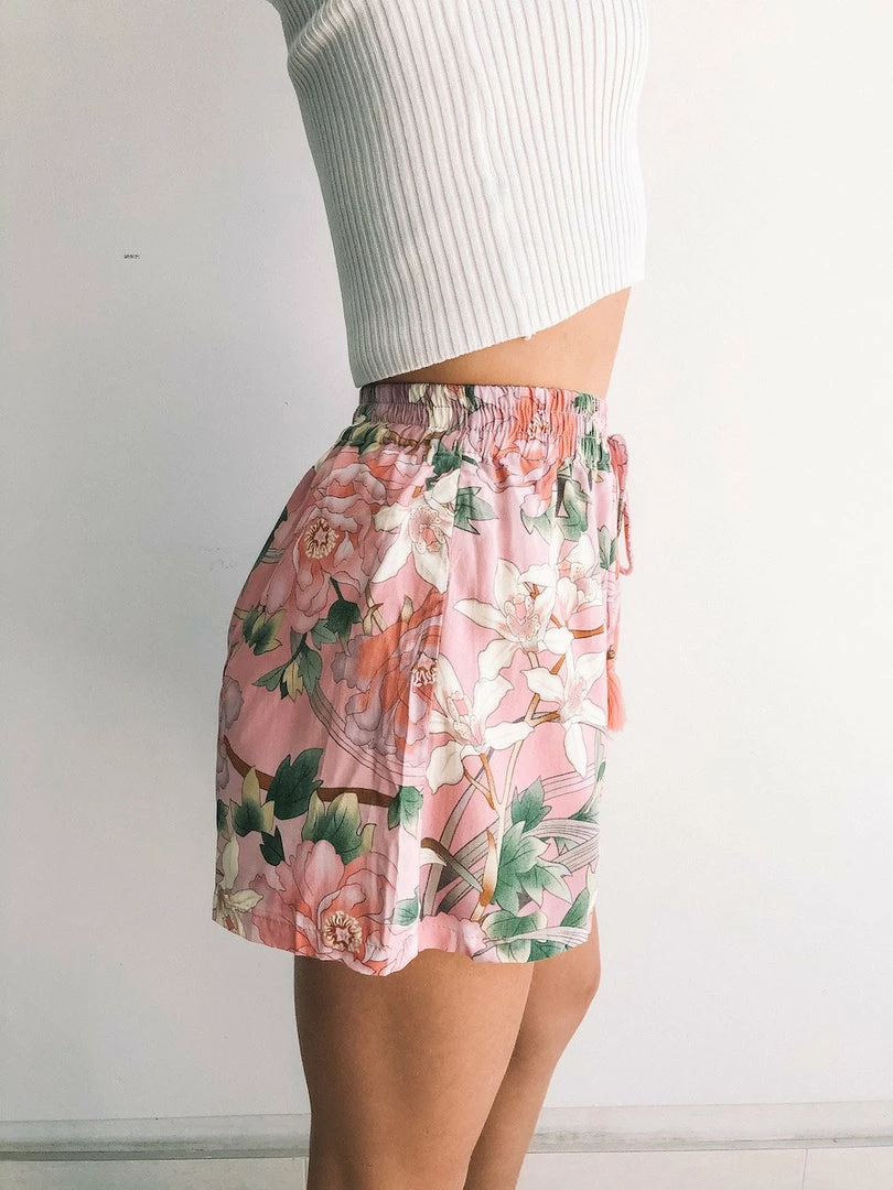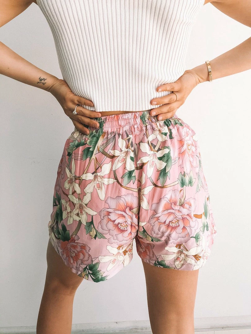Our Kimmie Shorts are a gorgoues baby pink colour with a fun floral pattern overlaid. These mini’s are the perfect pop of colour to add to your summer wardrobe and are best paired with the matching Kimmie Kimono.