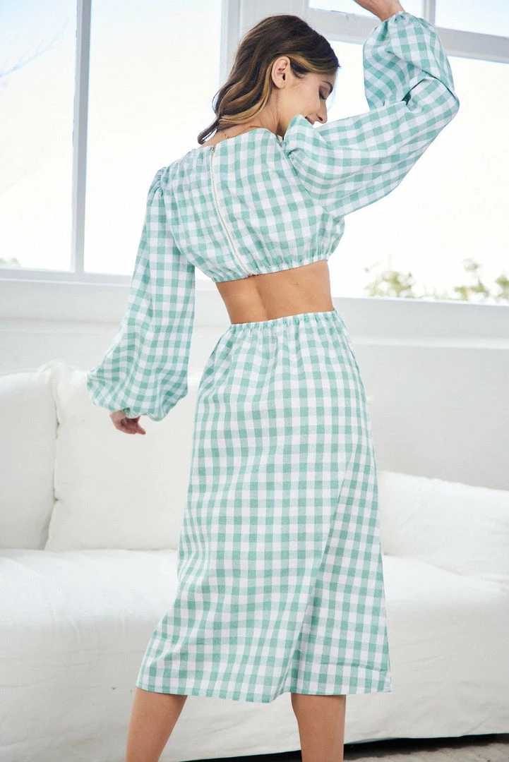Our Aletha Dress comes in a sage and white gingham print. It features a round neckline, long bishop sleeves and a circular buckle to bring the dress together at the front. This two piece midi is a stunning piece for your next formal event!