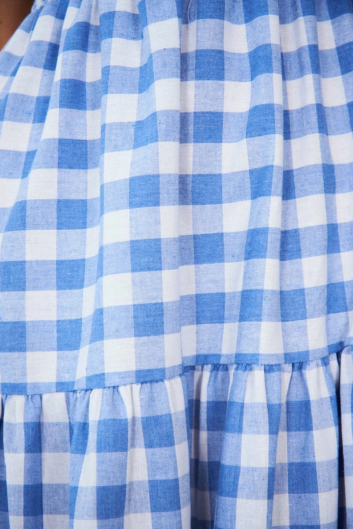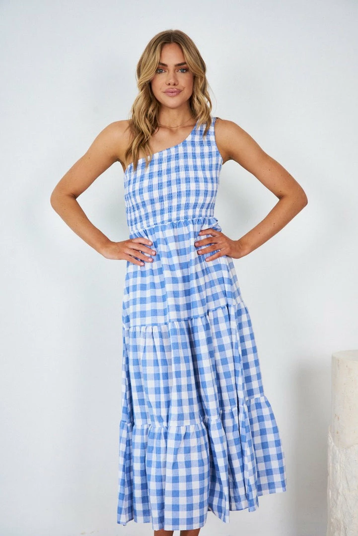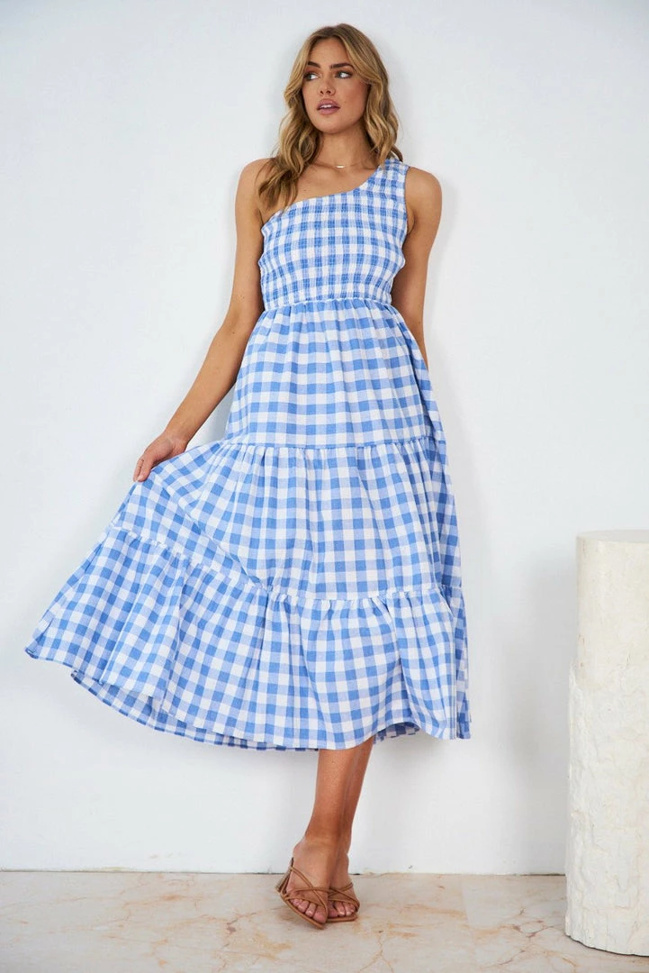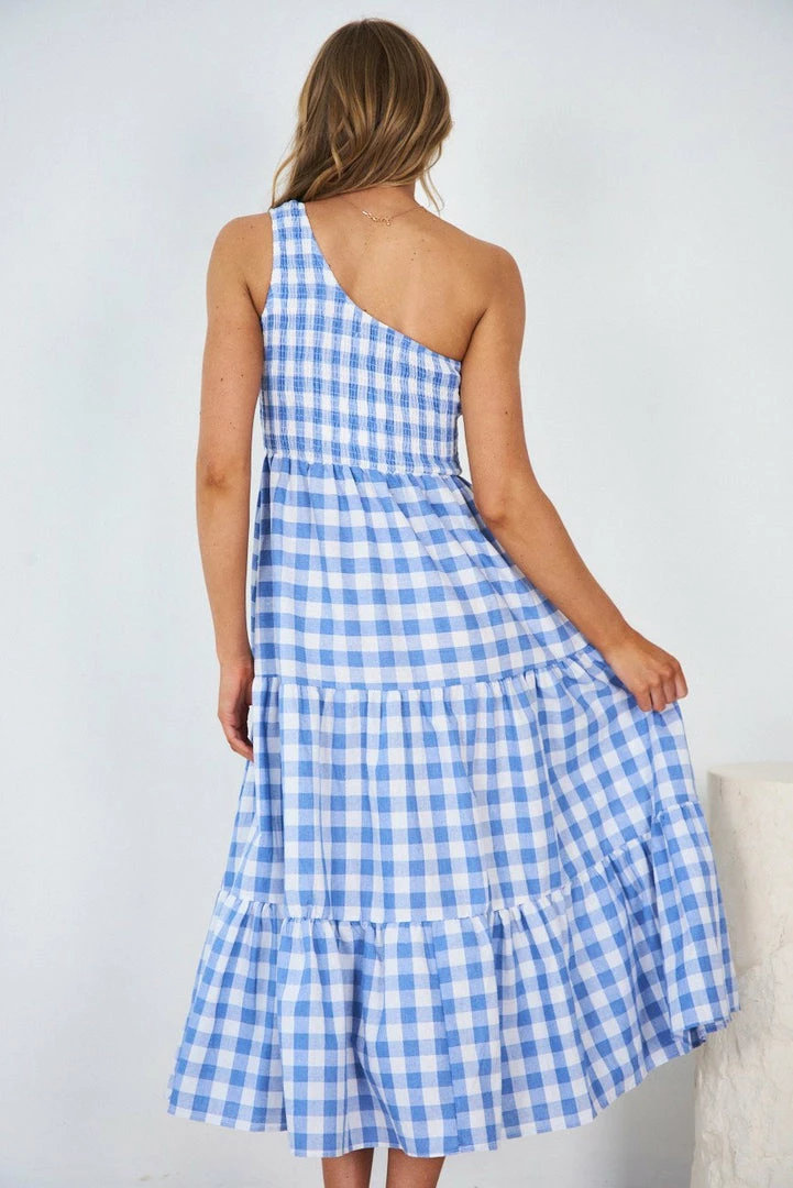Our Claudia Dress comes in a blue & white tone gingham print. It’s a sleeveless midi that features an asymmetric neckline and a tiered skirt for a stunning transseasonal look!
