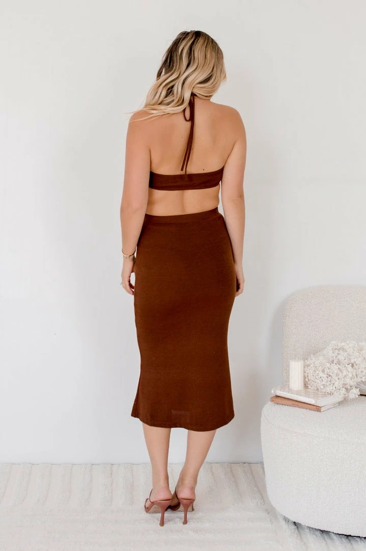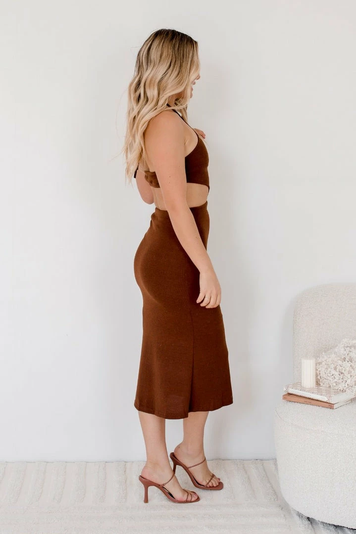 Our Sabia Dress comes in a warm chocolate tone. It’s a two piece style with side cutouts that make for a comfortable fit. Pair with your favourite pair of heels for a classy, elegant look!
