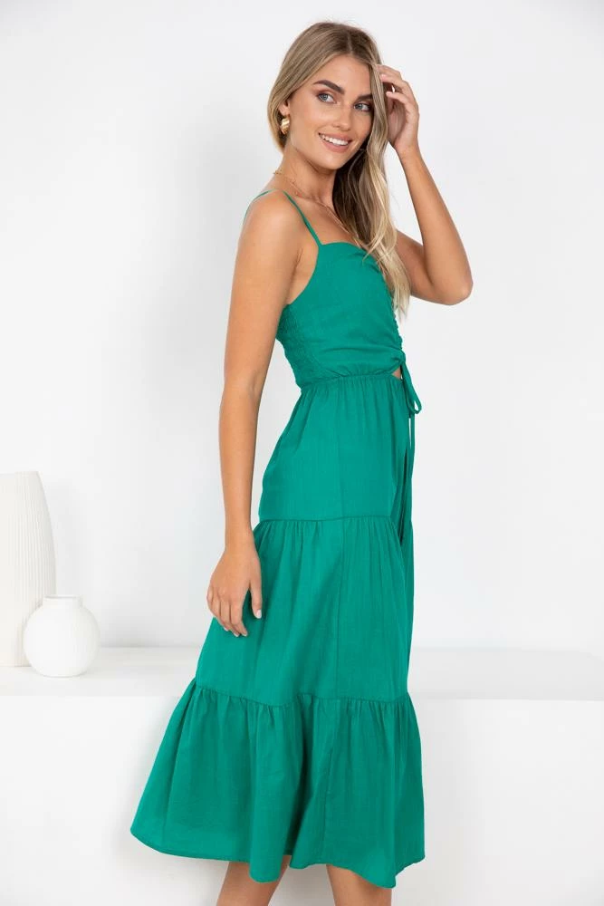 Our Dapper Dress comes in a lovely jade green tone. This midi features a spaghetti strap with tie detailing on the bust that adds fabness! She pairs beautifully with white flats for an off-duty look.