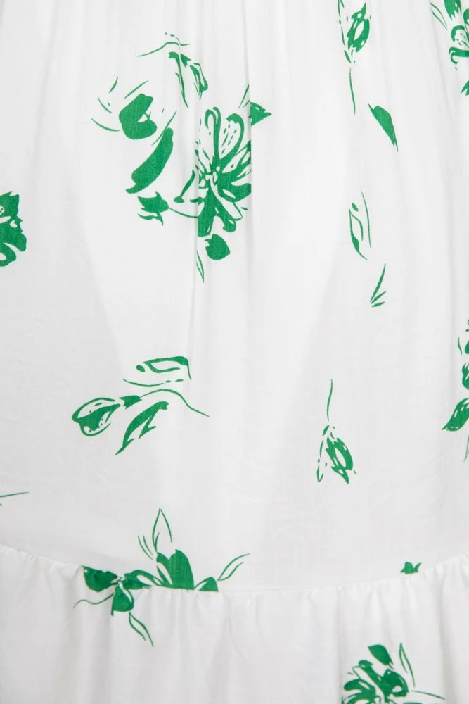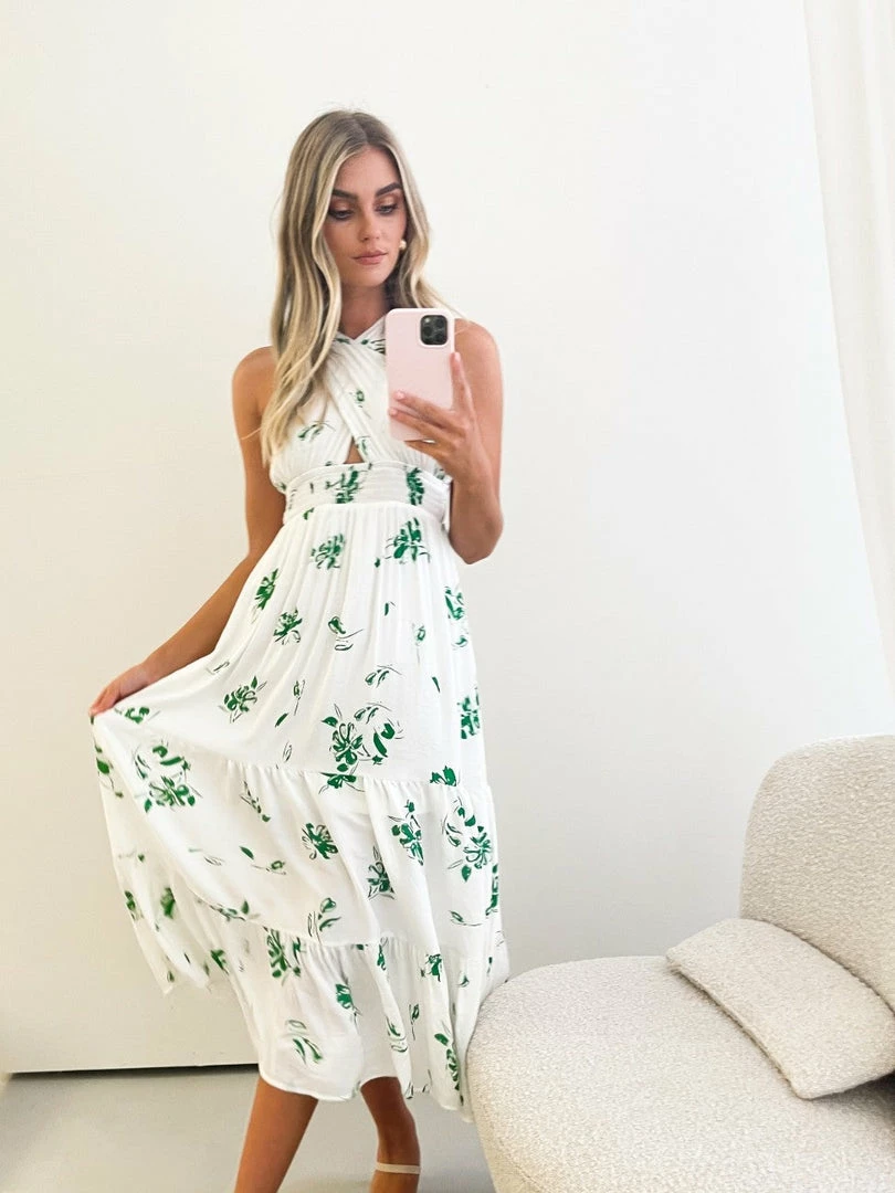 Our Snacked Dress comes in a pleasant white tone base with green leaves print. This midi features a cross-over halter neckline, flexible waist, perfect for a precious growing baby bump, and a tiered flowy skirt with gathered fabric detailing are a lovely addition to this piece.
