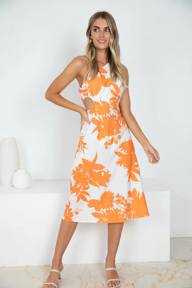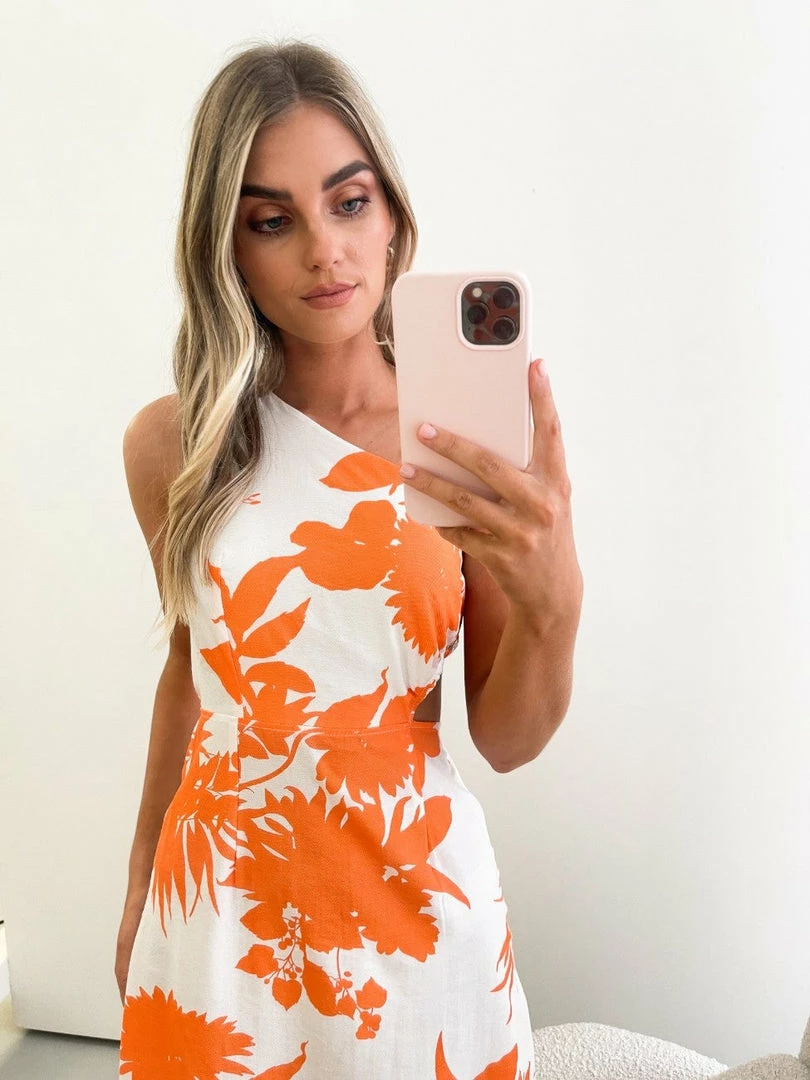 Our Kindly Dress comes in a classic white tone base with an orange tone floral print. This midi features a one-shoulder, asymmetric neckline, cut out on the side of the waist, and a flowy skirt. She pairs beautifully with white flats for an off-duty look.