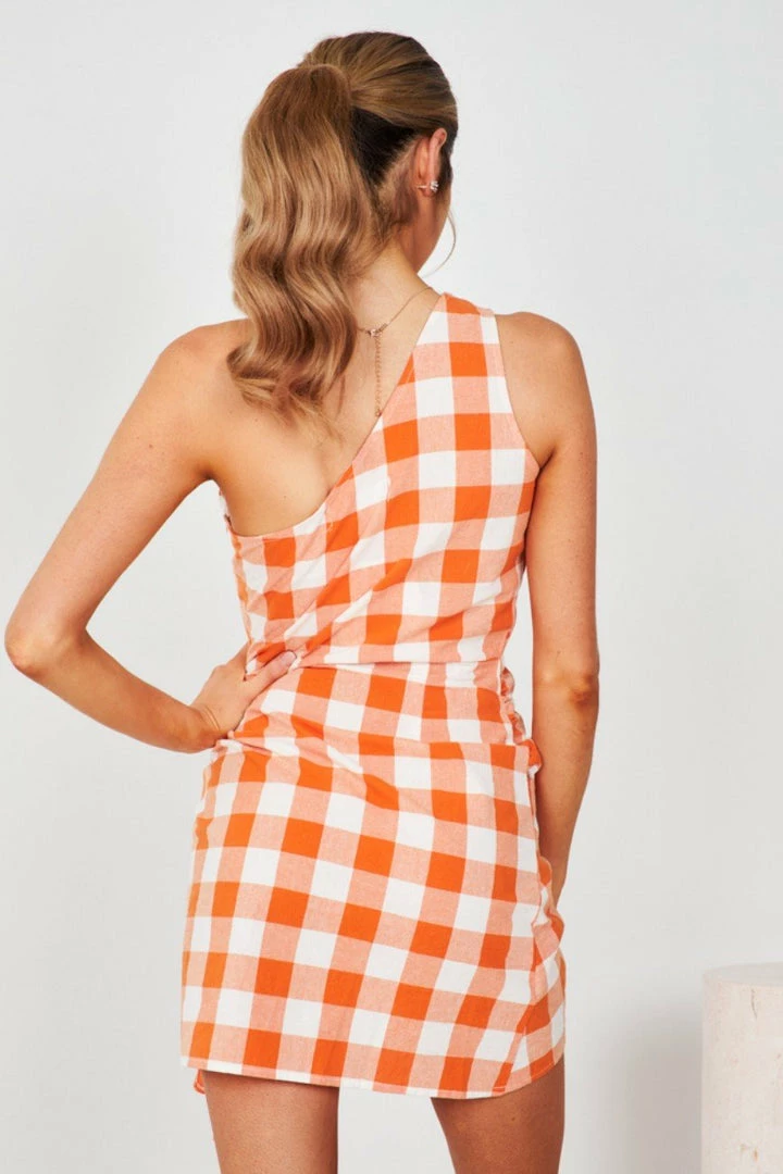 Our Mulanay Dress comes in a stunning orange and white gingham print. This one-shouldered Mini features a gathered fabric on the waist to cinch in the figure. The tied-up skirt gives this beautiful piece shape and glam. Paired with your favourite tan or nude heels, this piece is perfect for upcoming summer events!
