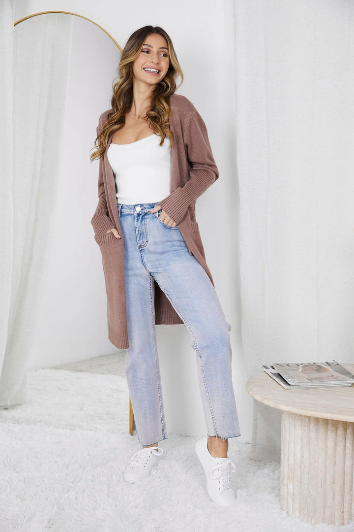 Our Artsy Cardigan is a lovely brown colour in a lightweight fabrication. The cardi features pockets on the front sides and fitted long sleeves for a snug and comfortable fit. Pair over your fave denim and lace singlet for a cute off-duty look.