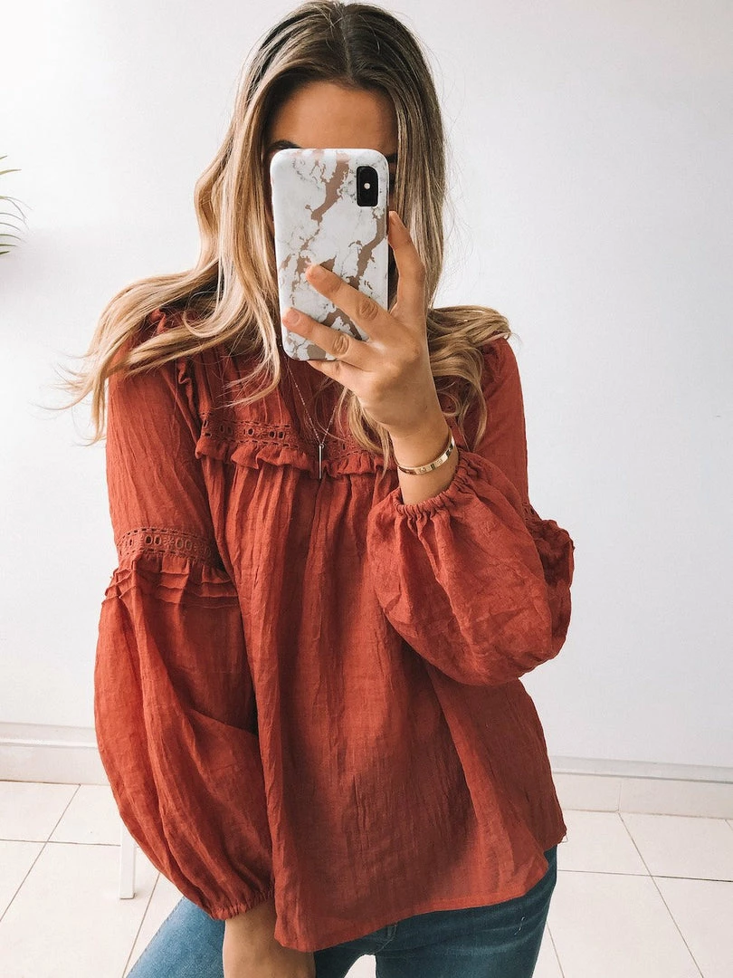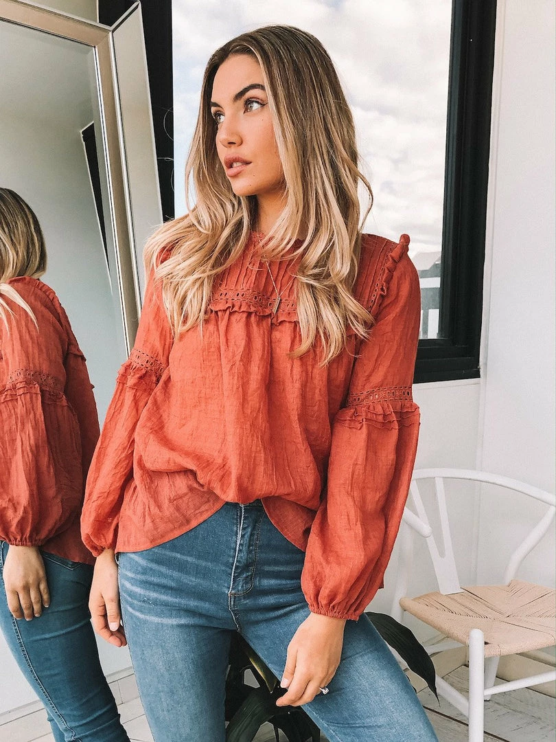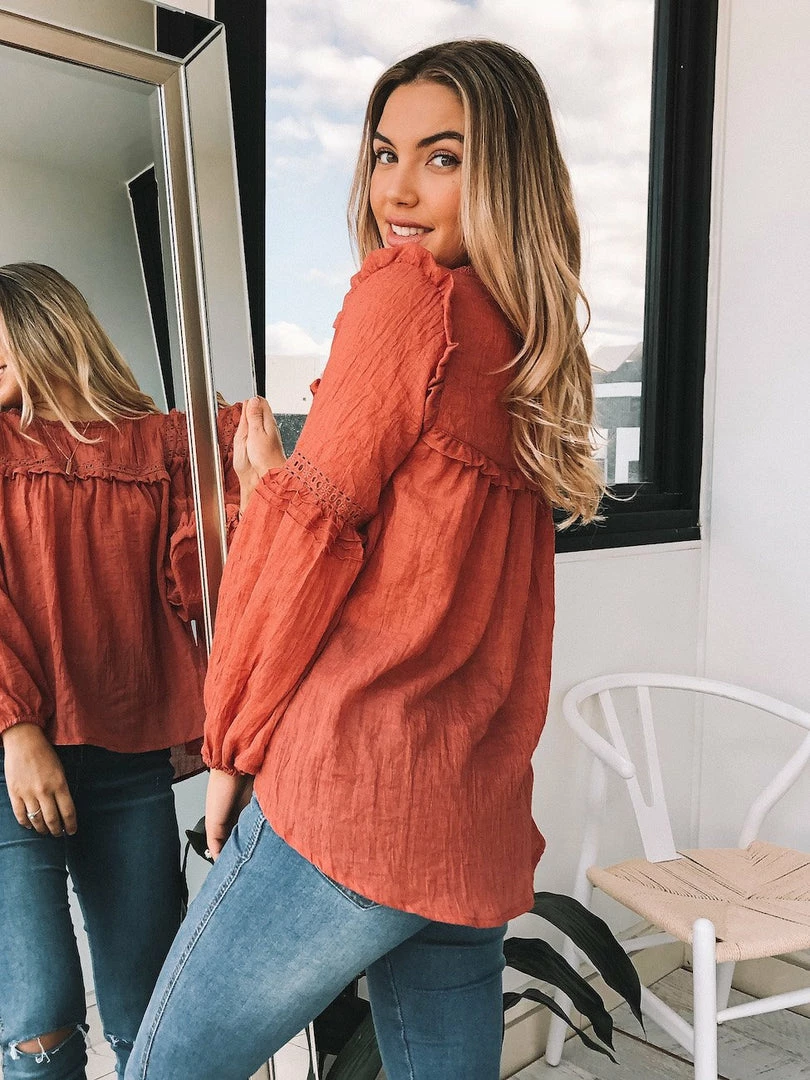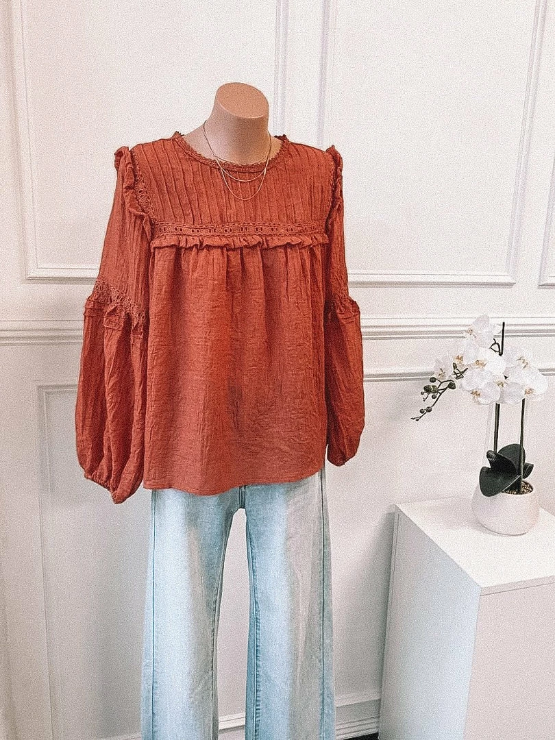 Our Honduras Top is a dark rust tone with dusty red undertones. This light and airy style is a relaxed fit perfect for growing bumps. The frill detailing on the bust & shoulder in addition to the embroidery detailing on the sleeve and bust make this a feminine and fun style. The balloon sleeves add drama whilst the elastic cuff is cinched for practicality. Pair with your fave denim & sneakers for the ultimate effortless off-duty outfit.
