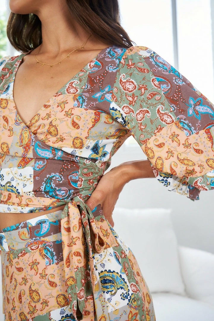 Our Josslyn Top comes in a vibrant orange, white, sage and cinnamon toned patch paisley print. It features a cropped length, v neckline, and long sleeves for a relaxed, comfortable fit. This top is the perfect addition to your spring wardrobe!