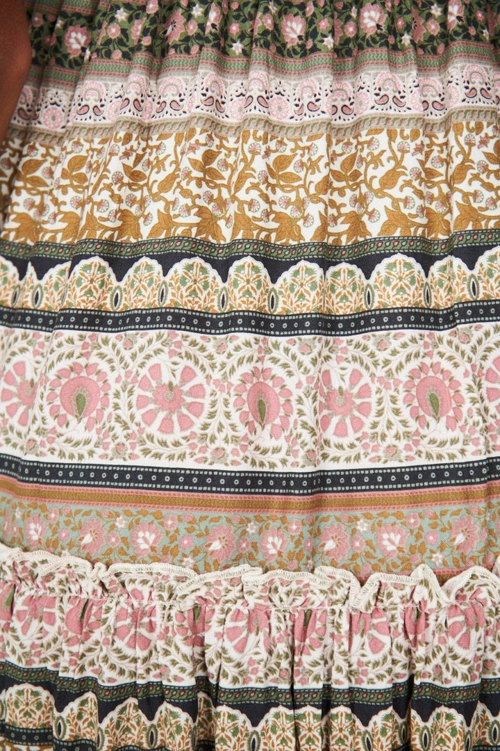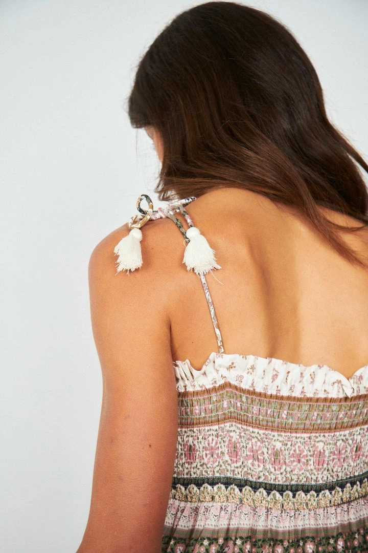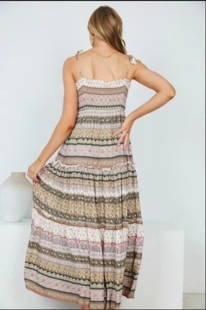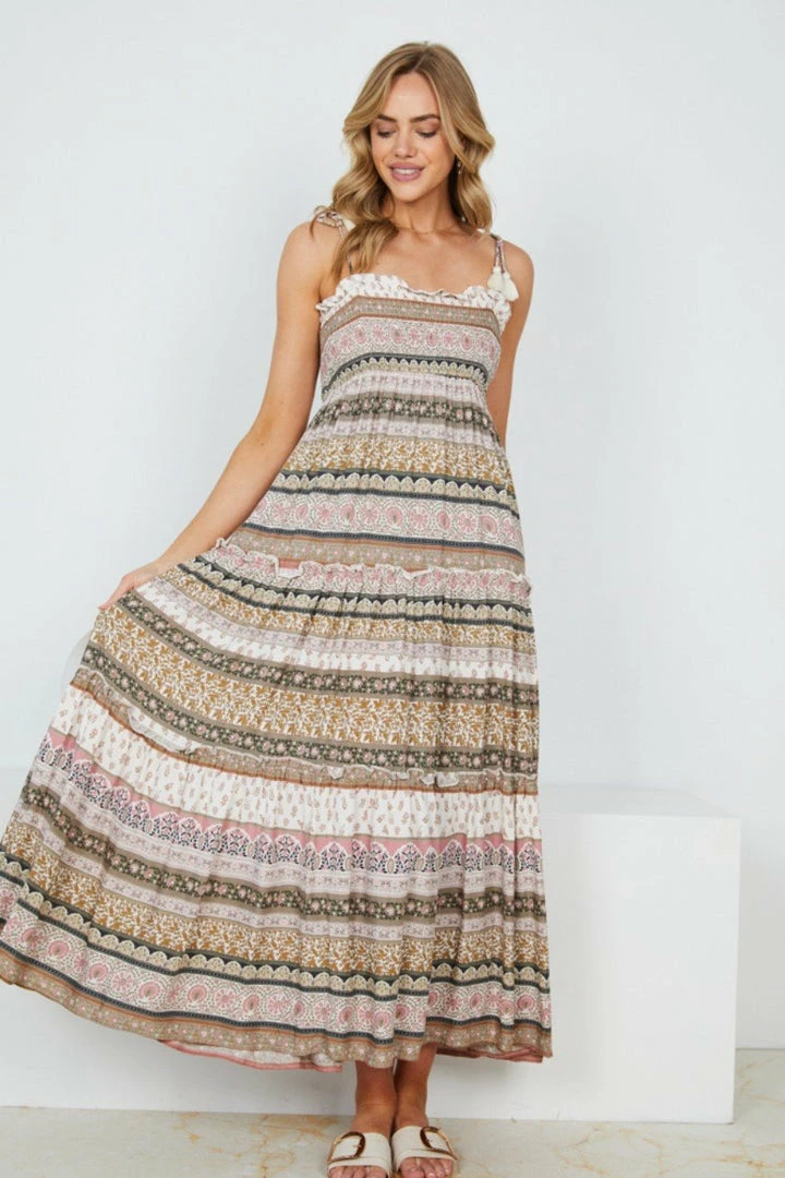 Our Delilah Dress comes in a stunning white, blush, brown & beige tone print. This breezy maxi features a straight across neckline, comfortable shirred bodice, adjustable spaghetti straps with tassel detailing, and frill detailing along the neckline and skirt. Pair this flowy midi with your favourite tan sandals for an effortless summer look.