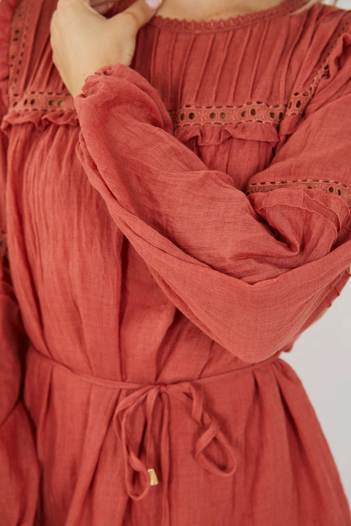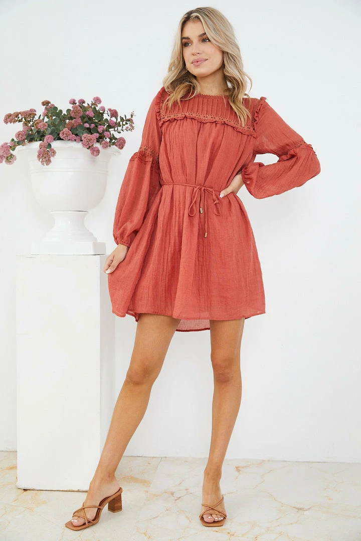 Our Ferrera Dress comes in a rust tone color. This gorgeous mini is made from a lightweight material featuring a long puff sleeve, with micro frill detailing on the shoulder and chest making this a feminine touch you’re sure to love. A must-have for your next family getaway!