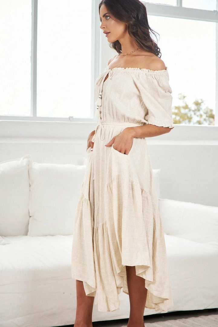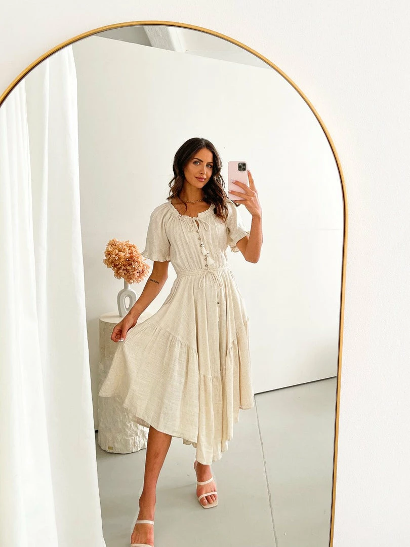 Our India Dress comes in a classic neutral beige tone. It features a v neckline, short sleeves, and a fabric drawstring to cinch in the figure beautifully. This flowy midi pairs beautifully with heels for a stunning transseasonal look!