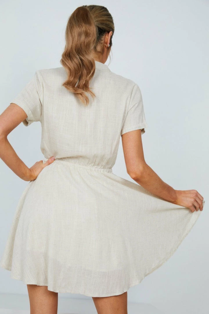 Our Jangle Dress is a light beige tone in a relaxed fit. This mini features v neckline and buttons on the front making this ideal for breastfeeding. The drawstring waist cinches the figure beautifully whilst the relaxed sleeves and skirt provide an effortless fit for the warmer months ahead. Pair with black wedges for your next brunch outfit.