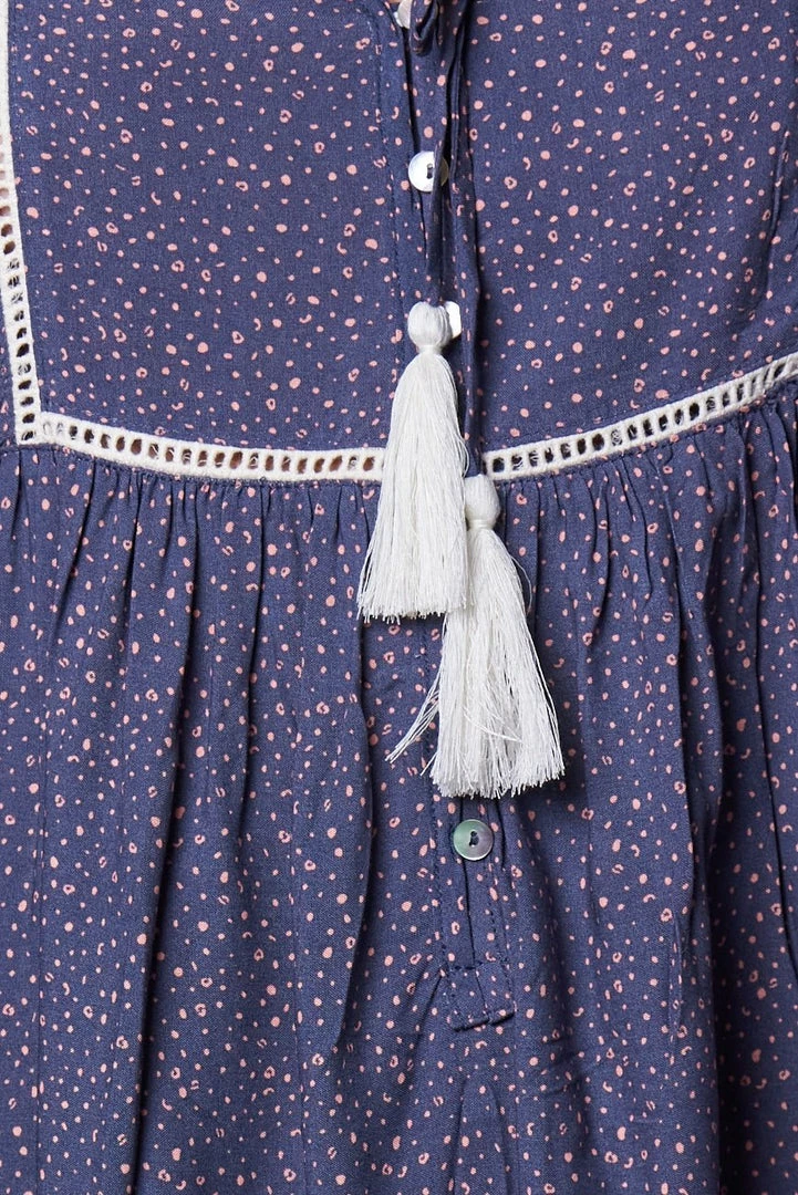 Our bestselling Etsy Dress comes in a blue tone base with a micro print. This relaxed fit dress is an effortless addition to the wardrobe in warm tones that work for all occasions whether that be brunch with the girls, a picnic with the fam or cocktails with the partner in crime. The gorgeous cream lace finishes are lovely trimmings you’re sure to love. The v neckline with tassel detailed ties & buttons on front make this a breast feeding friendly number!