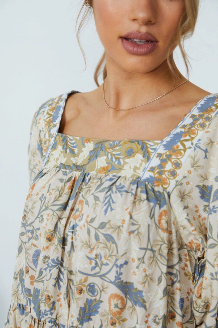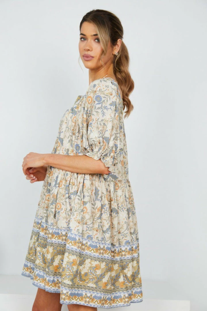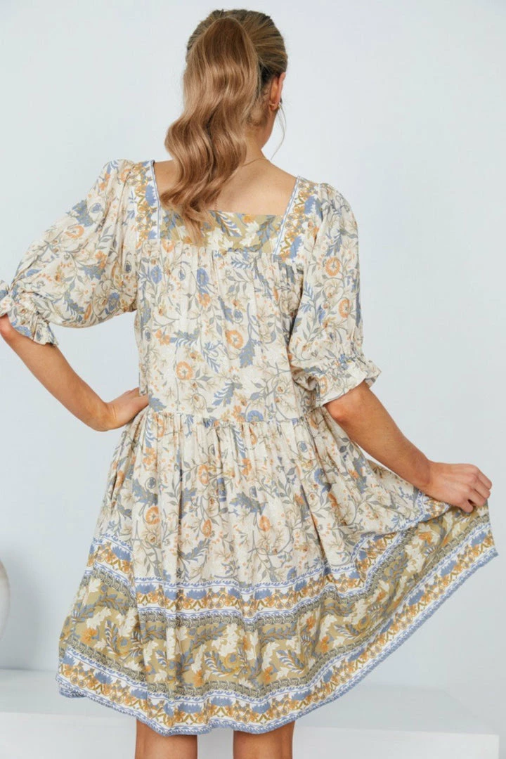 Our Hayleigh Dress comes in a light beige undertone featuring blue, orange, and grey toned print. It’s a short sleeve mini that features a square neckline for a relaxed, comfortable fit. This flowy mini pairs beautifully with tan slides for an effortless look!