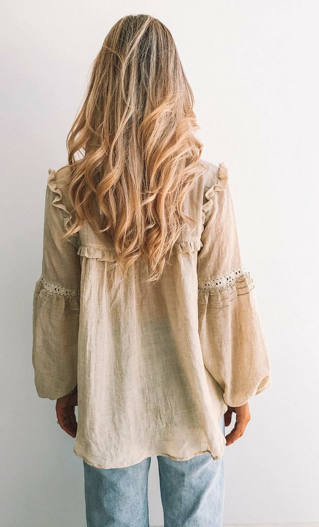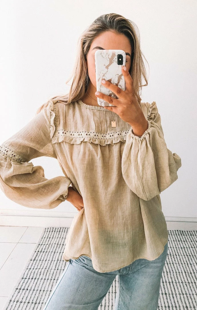 Our Honduras Top is a sand tone with dusty olive undertones. This light and airy style is a relaxed fit perfect for growing bumps. The frill detailing on the bust & shoulder in addition to the embroidery detailing on the sleeve and bust make this a feminine and fun style. The balloon sleeves add drama whilst the elastic cuff is cinched for practicality. Pair with your fave denim & sneakers for the ultimate effortless off-duty outfit.