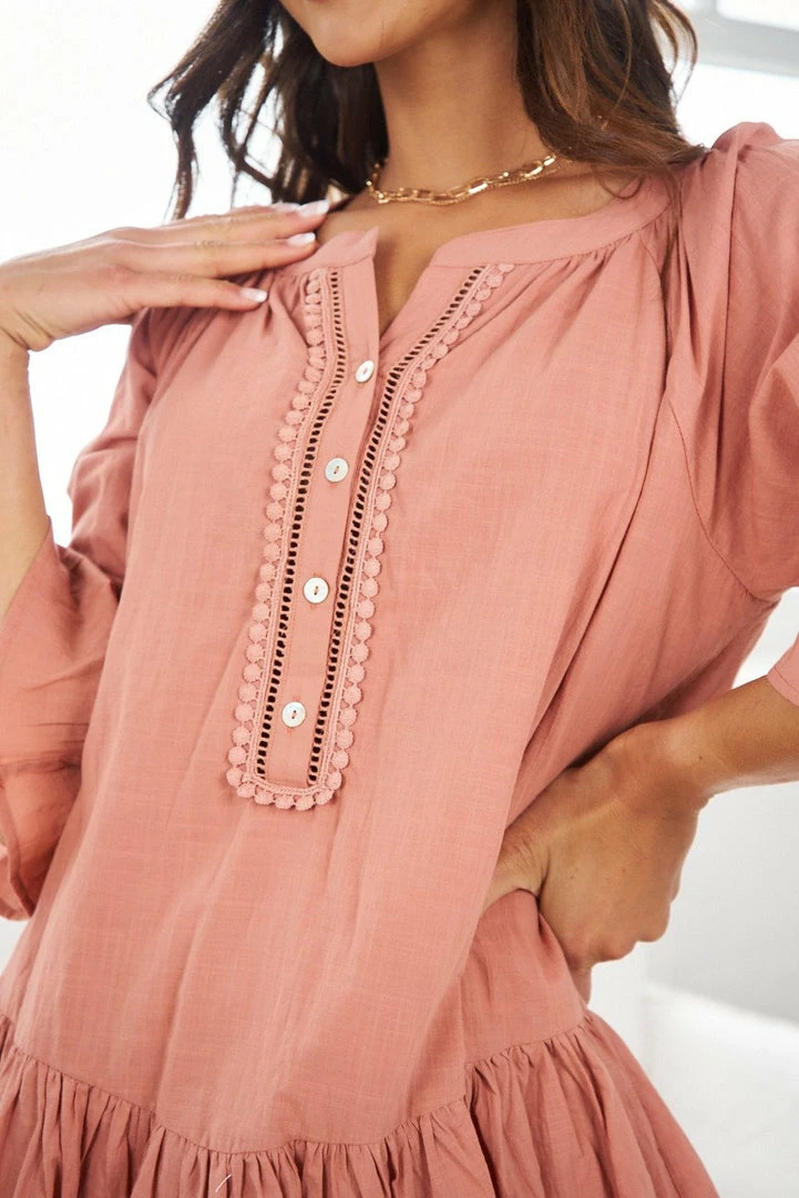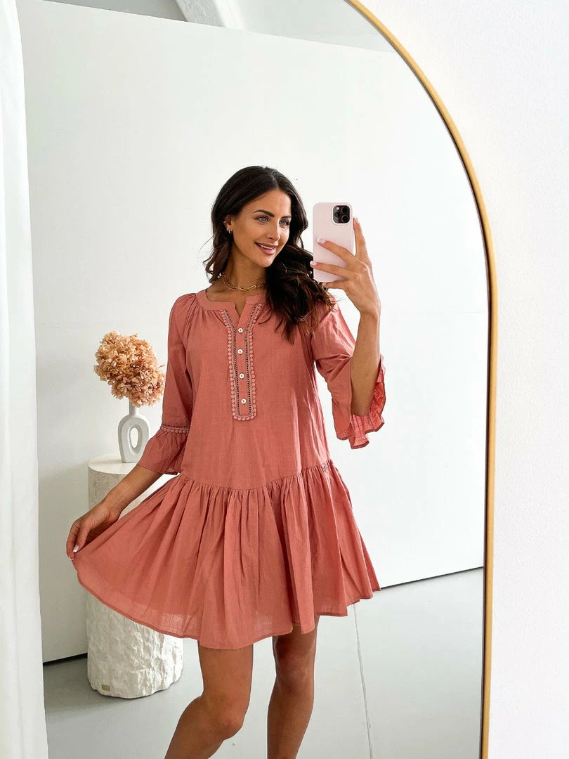 Our Our Idony Dress comes in a coral pink tone. It features a v neckline, short bishop sleeves, and an embroidered pattern down the front. This flowy midi pairs beautifully with heels for an effortless transseasonal look!