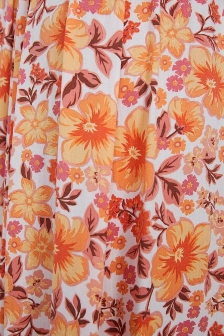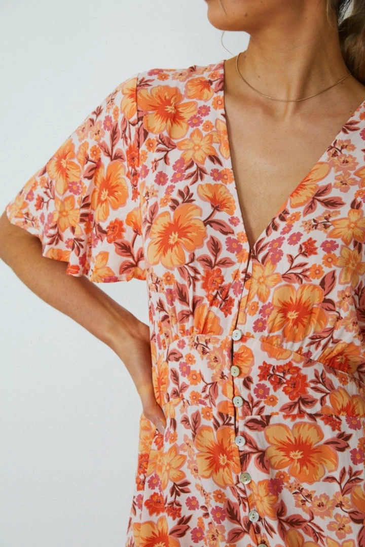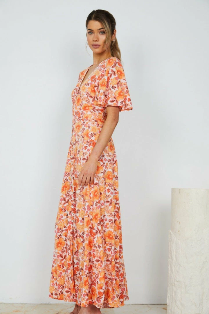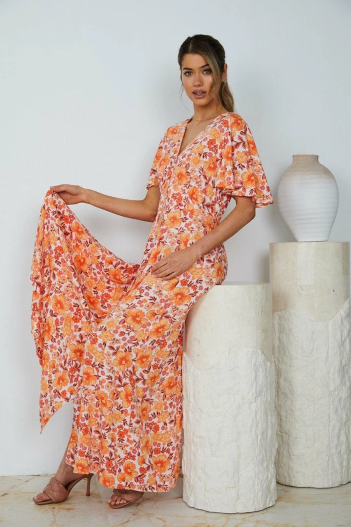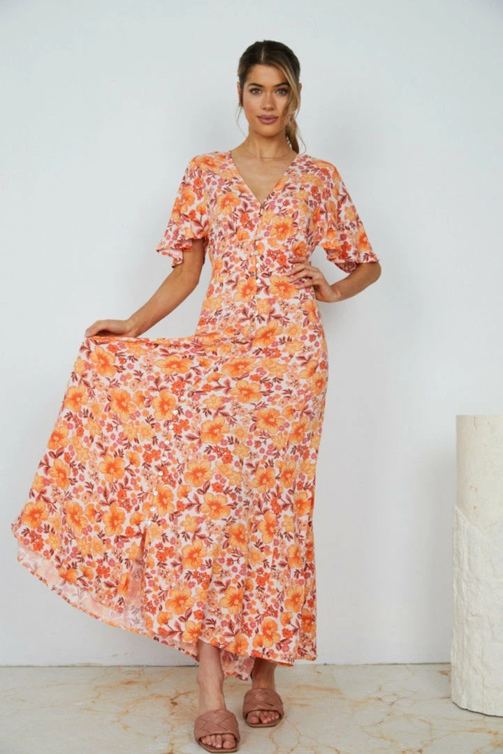 Our Ranchero Dress comes in a white base with vibrant orange, yellow, red, and brown toned floral print. This relaxed fit maxi features a V neckline and buttons on the front making this ideal for maternity wear. The butterfly sleeves are a feminine & fun addition that floats in the breeze. Pair with gold earrings & a rattan bag for a gorgeous brunch outfit.