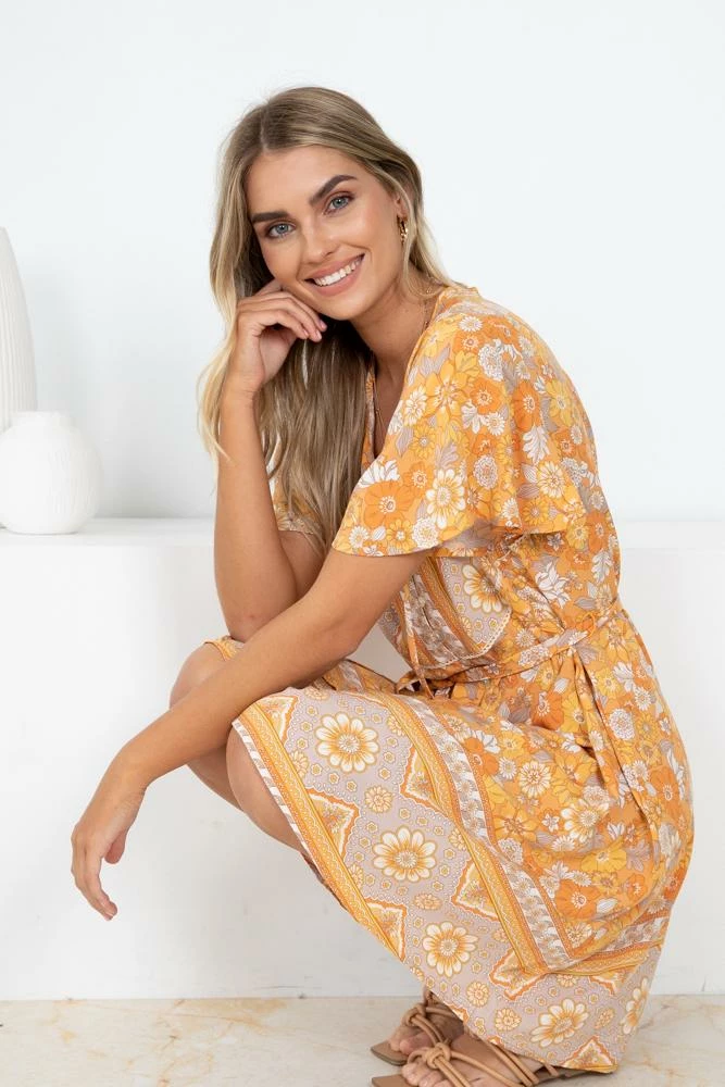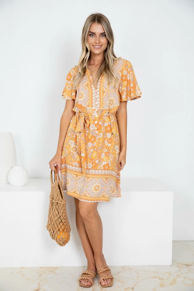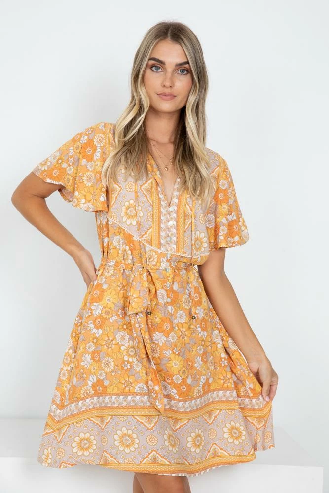 Our Shimma Dress comes in a lovely sherbert orange tone floral print in a relaxed fit. This mini features a v neckline with tassel detailing & functional buttons, perfect for breastfeeding mums. The butterfly sleeves and hanging free skirt gives this a flowy look. This effortless piece will surely become a staple in your summer wardrobe!