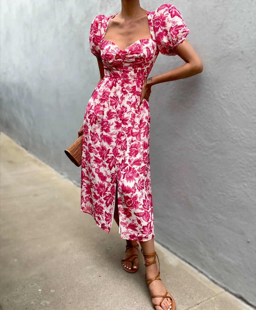 - Key Features: Midi length. Relaxed fit. Queen Anne neckline. Short sleeves.